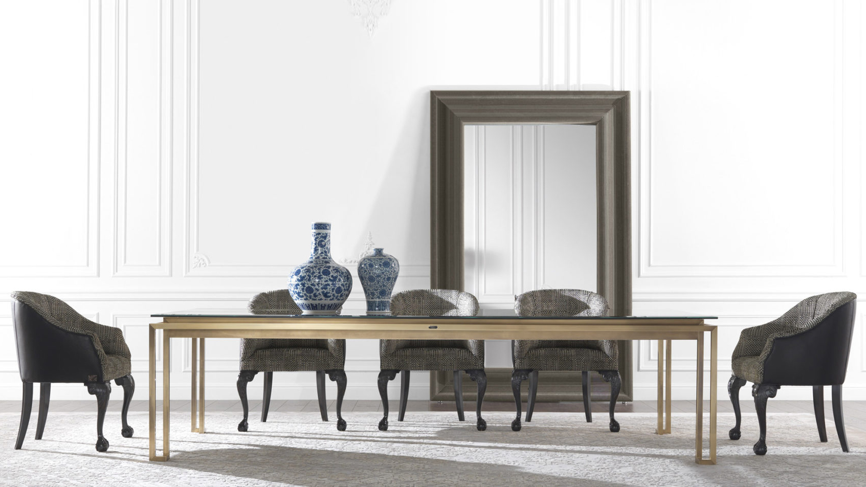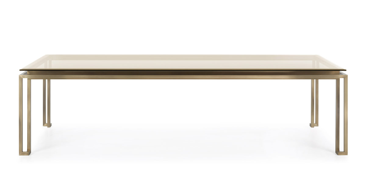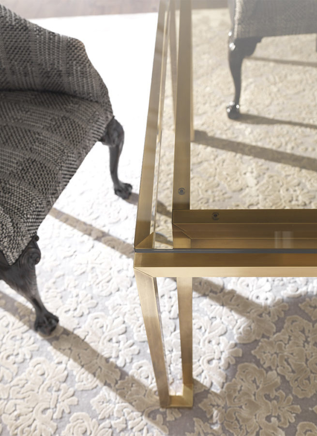 Elegant and refined, Trafalgar table with art deco details has a base in satin brass and a top in extra clear bevelled glass top. The combination of different precious materials and its elegant lines make it suitable for contemporary urban chic settings as well as for more classic and luxurious spaces.