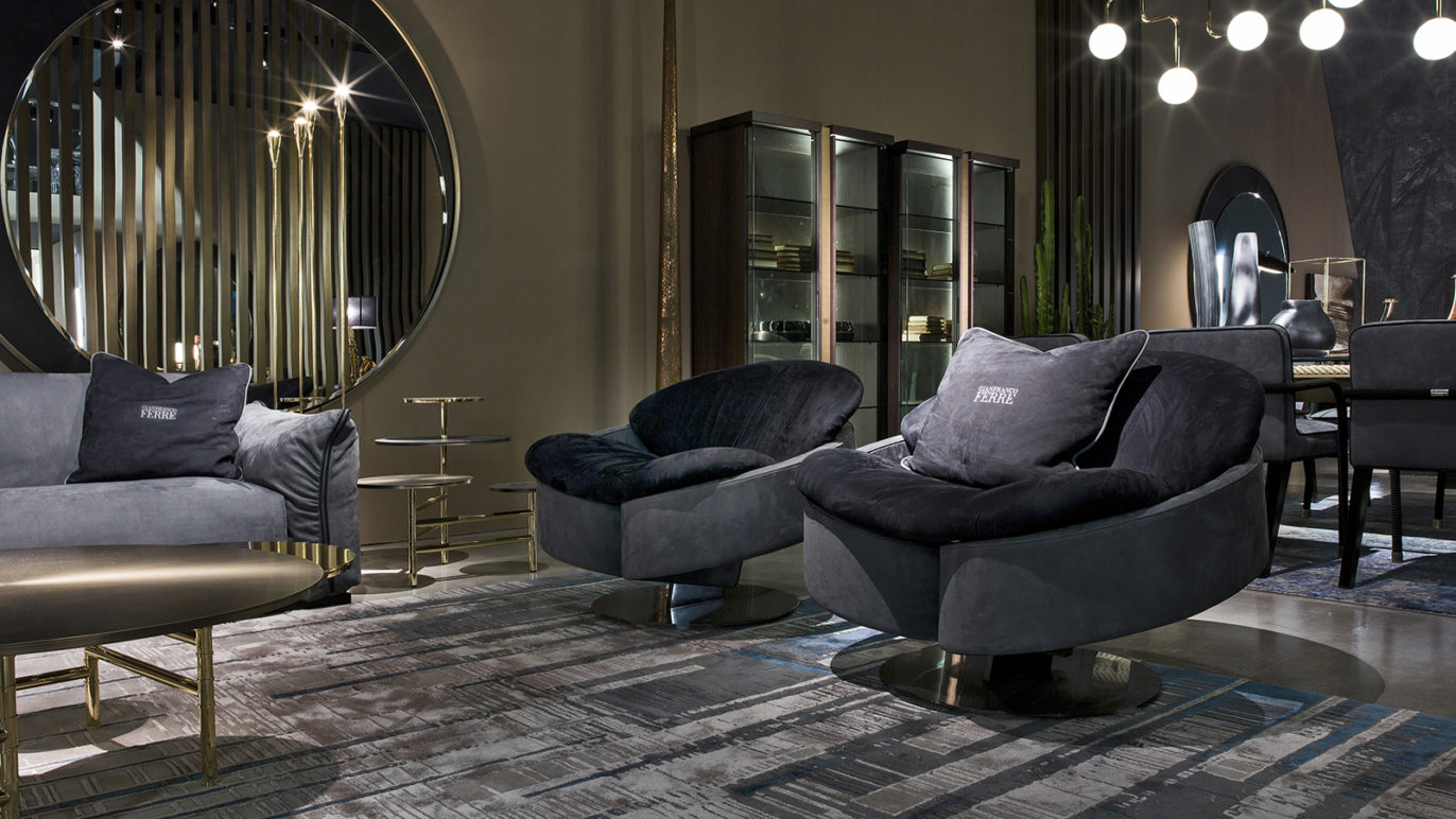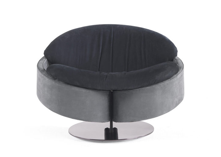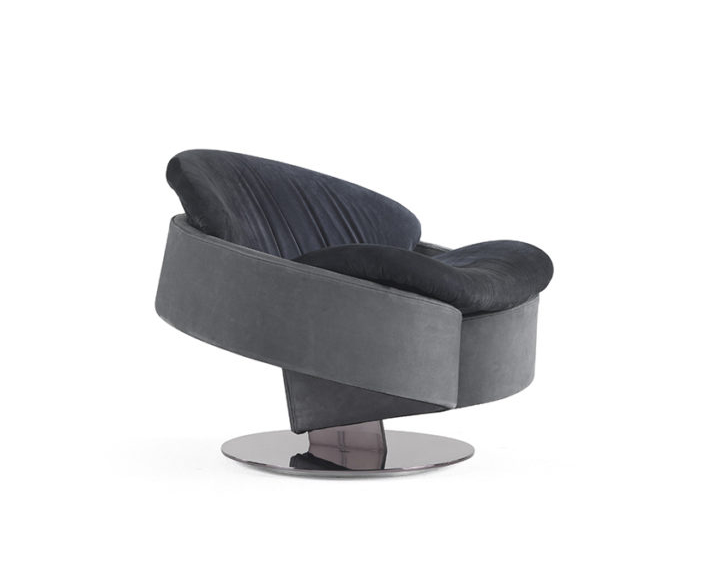 Presented for the first time at the 2018 Salone del Mobile, the Sherlock armchair is proposed in the 2019 collection with leather upholstery and a swivel base with black chrome finish. Characterized by a steel base with a single central vertical element to support the weight of the armchair, the Sherlock armchair features a complex design and manufacturing. The band that wraps around the armchair creating the backrest and arms is a curved wood with a double slope; a complex element requiring a precise and articulated carpentry work.