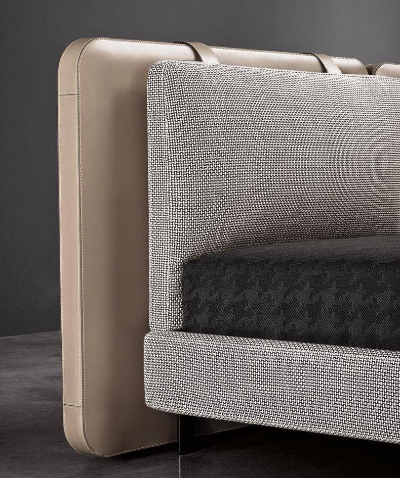 The cushions attach to the headboard with luxury saddle-hide straps. The bed rests on elegant cast aluminum feet with paint-ed Pewter finish.