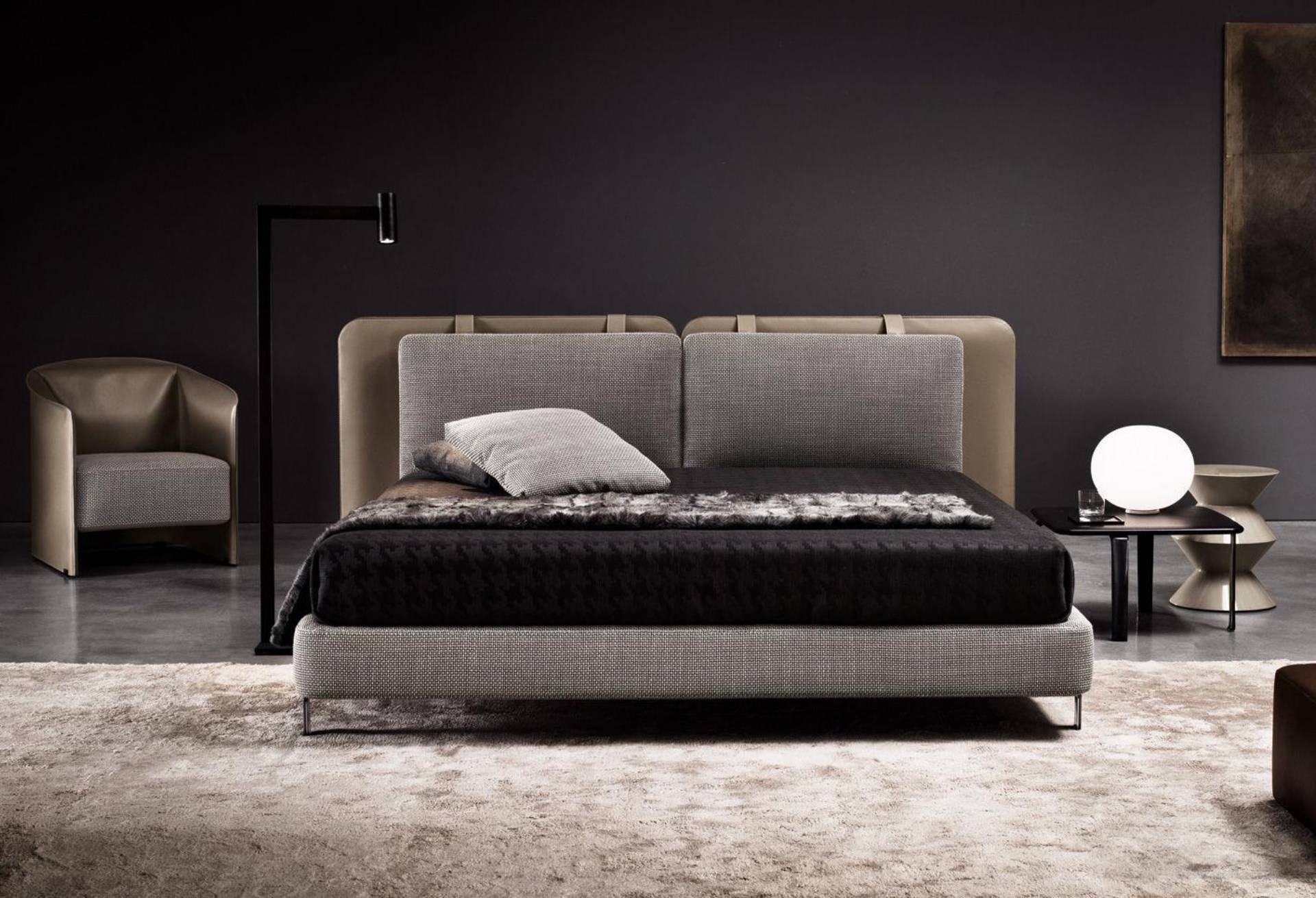 Upholstered in saddle-hide, the Tatlin-Soft headboard comes in the shades of Mud, Tobacco, Dark Brown and Black and features accessory cushions in the same fabric as the bed frame.