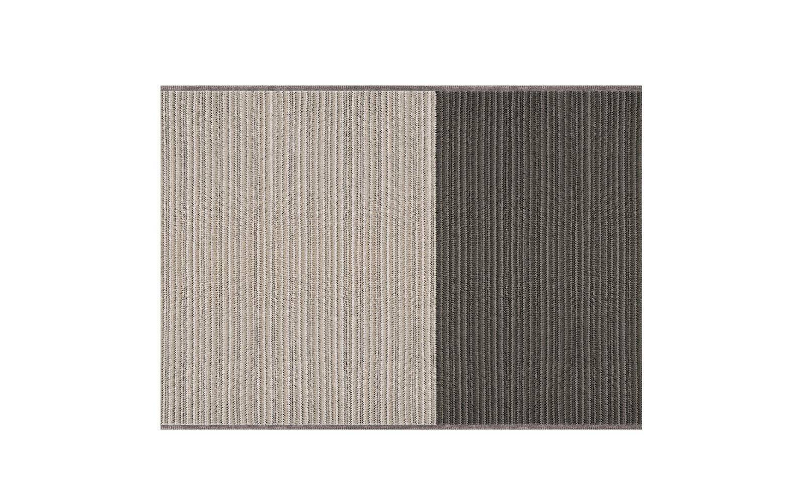 The rug has a plaited structure with a tricot effect, made of permeable, breathable acrylic yarn, making this rug truly ideal, even in humid environments. Durable, invisible stitching joins the mélange acrylic yarn plaits while the border on two sides is in a neutral grey.