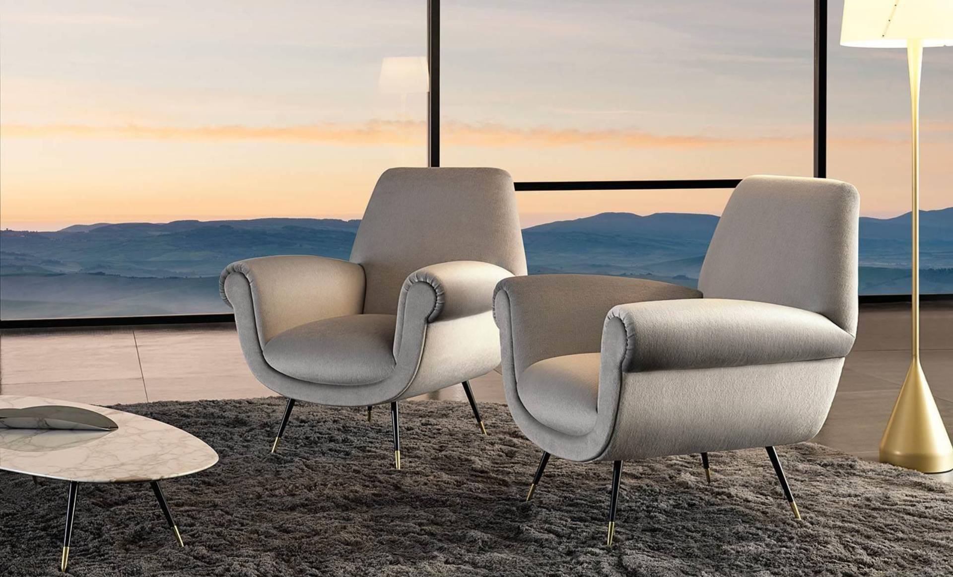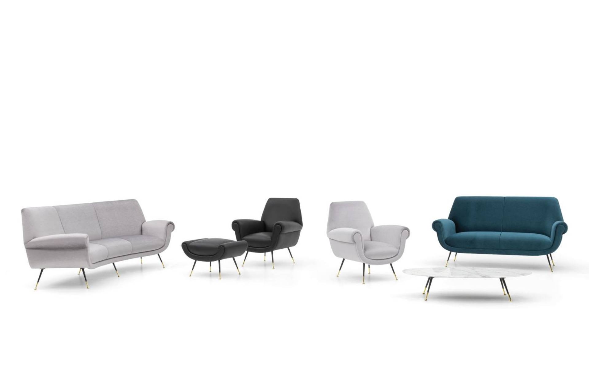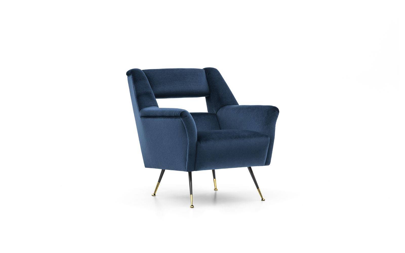 Albert maintains the 1900-inspired armrests and classic lines reinterpreted by the aesthetics of the Fifties. A decorative front element runs along its entire length and draws the armrest: made of solid wood, it is first covered and then fixed with nails to the main structure.