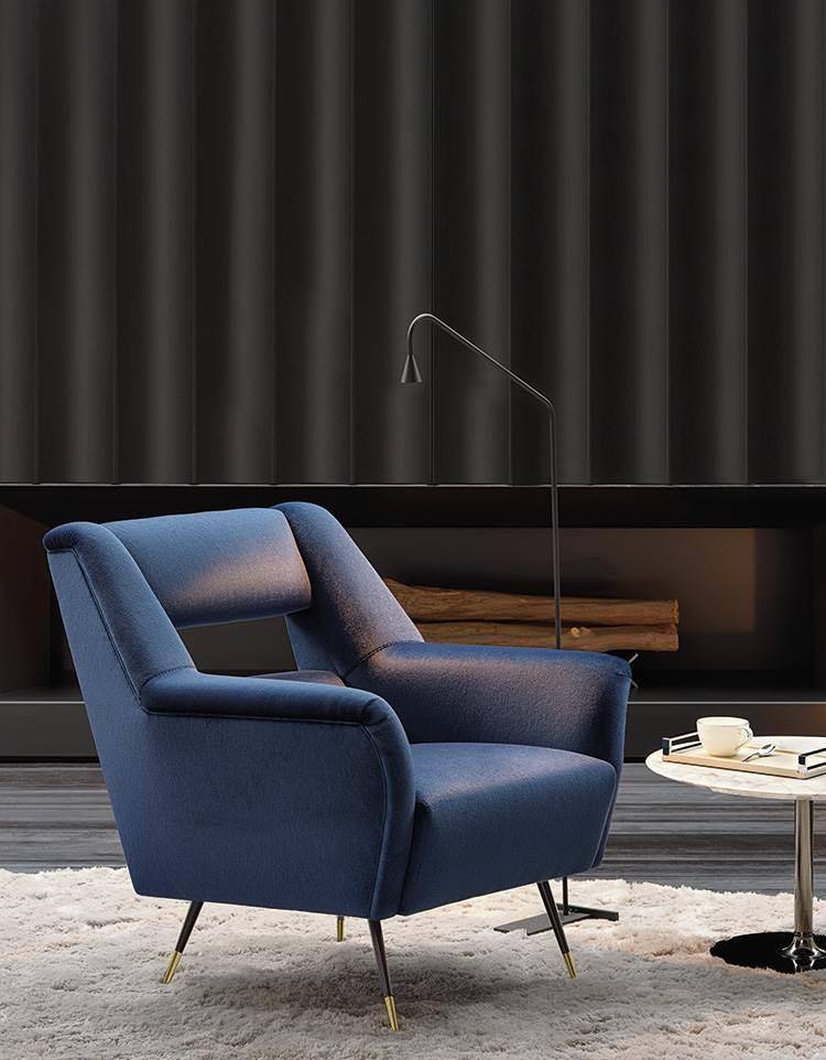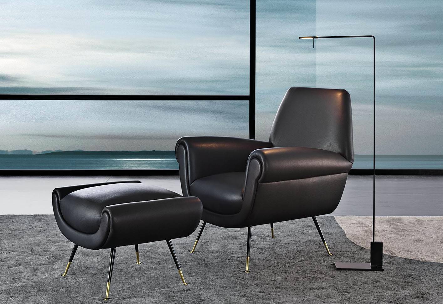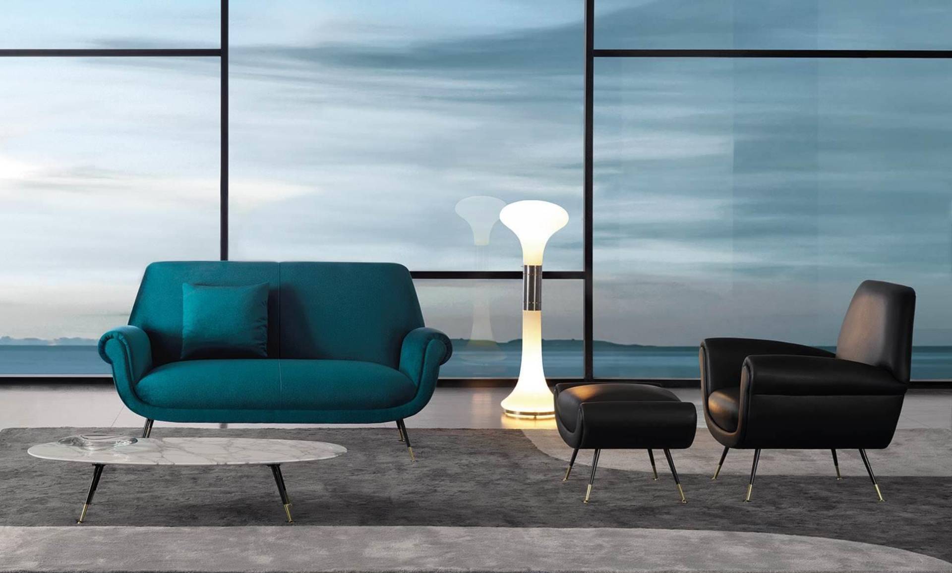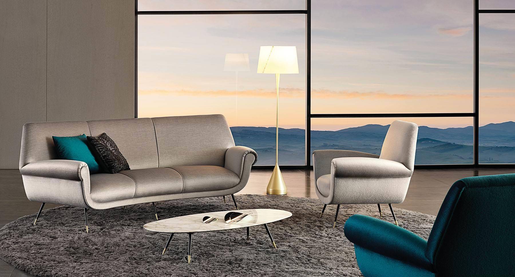 Albert maintains the 1900-inspired armrests and classic lines reinterpreted by the aesthetics of the Fifties. A decorative front element runs along its entire length and draws the armrest: made of solid wood, it is first covered and then fixed with nails to the main structure.