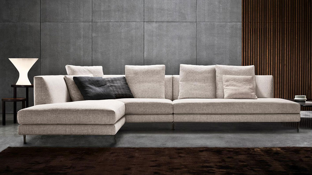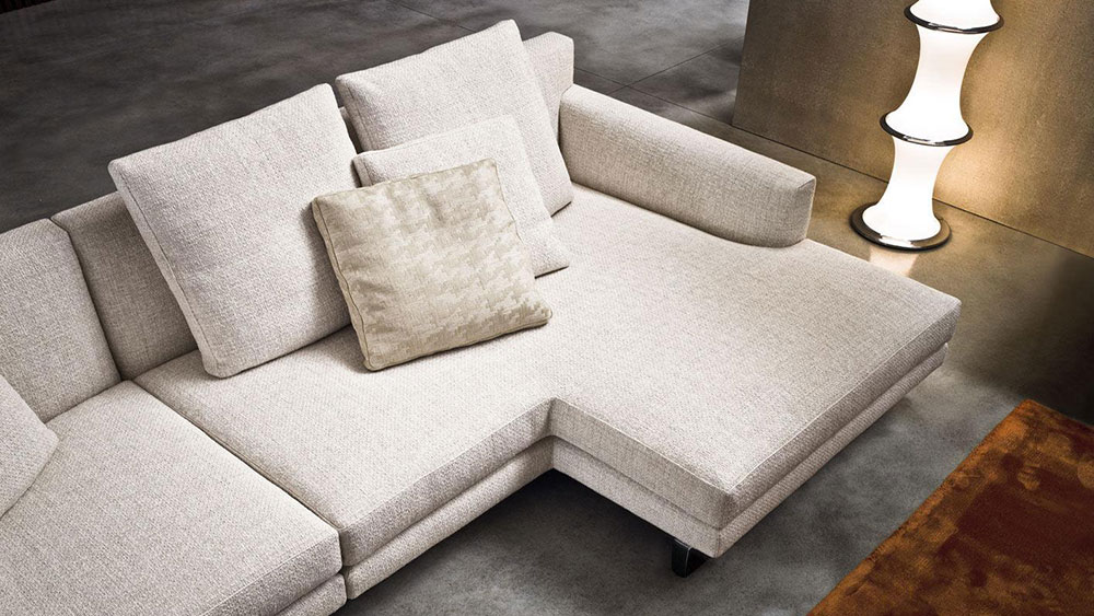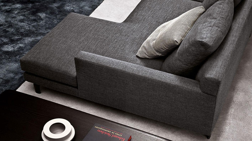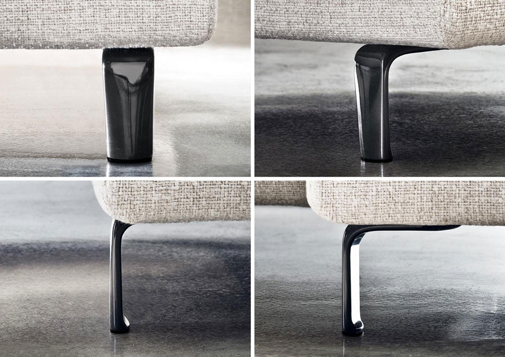Spotlight on feet: made of die cast aluminium, in Pewter colour (a shade created by Minotti Studio) they have sinuous lines and classic structure, in both proportions and materials. Molded, they are the result of technological research and reinforce the association between Minotti and uniqueness. In terms of foot placement, they’re seen in profile when the sofa is viewed from the front, while the flat surface is visible when the sofa is viewed from the back or side. A totally new design concept: unlike traditional chaise longues that form the end unit of a seating composition, this element already possesses a “hint” of the sofa in its shape. Thanks to its “L-shaped” design, it foreshadows the sofa and carries it forward. Minotti also solves the problem of overlapping feet in the corner, and preserves the purity of design. A sense of clarity enhances the value of this piece in a key area of home living - the place for socializing with friends and enjoying family companionship.