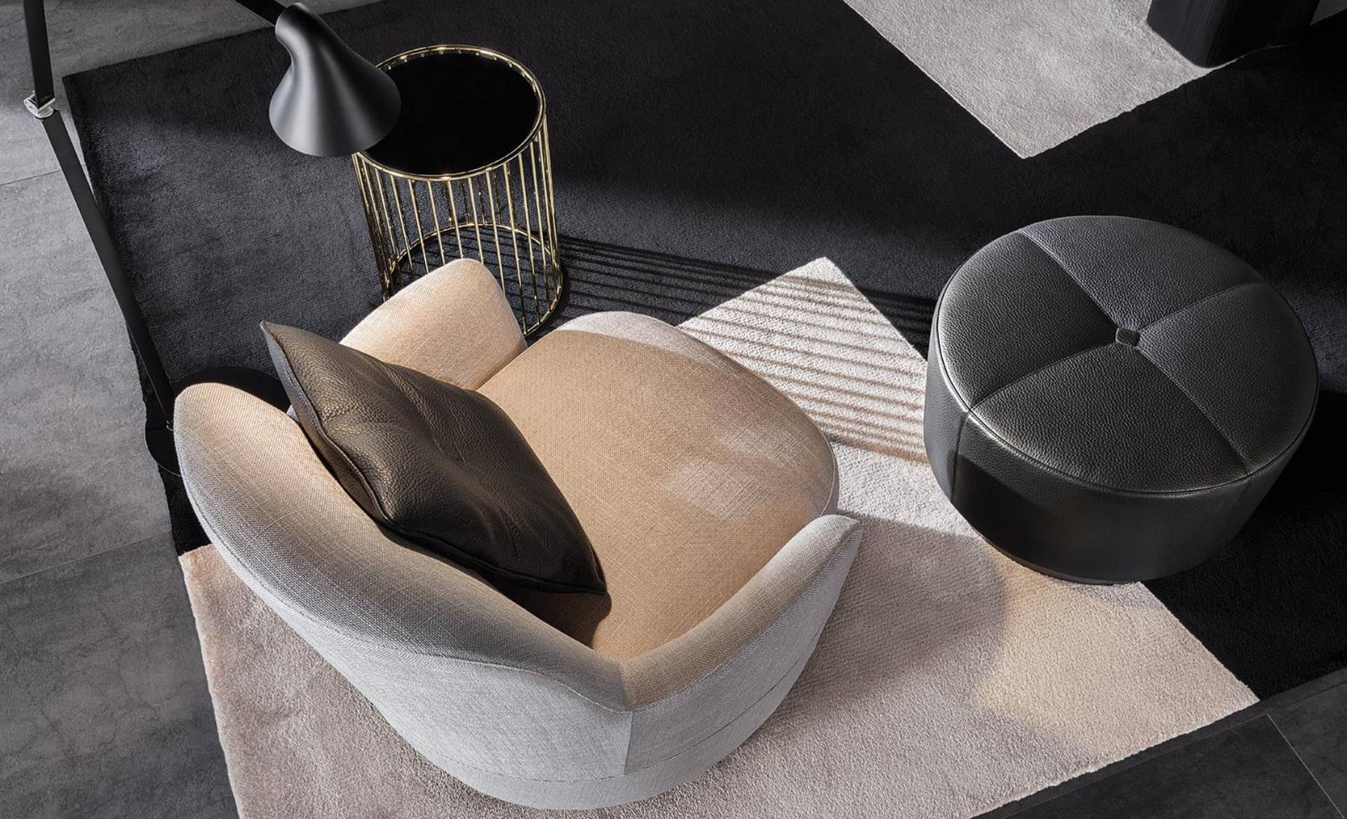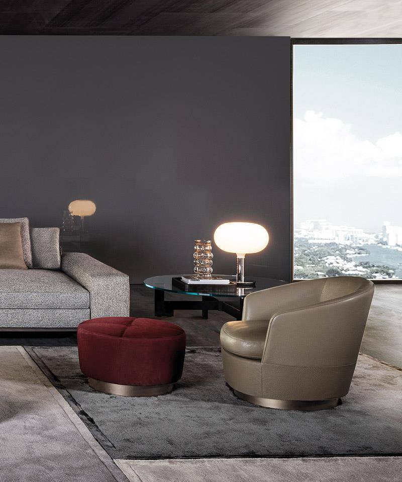 Thanks to its soft seat cushion and backrest padding, the Jacques bergère, available both with fixed and swivel base, with swivel base is extremely comfortable and lends itself to the creation of spaces where relaxation is key. When combined with its ottoman and the Song coffee table that embraces the armchair with its organic shape, it becomes a functional table-top surface for a lamp or to display various kinds of objects.