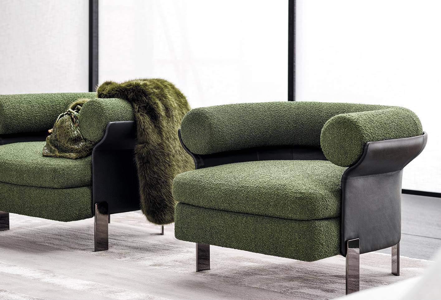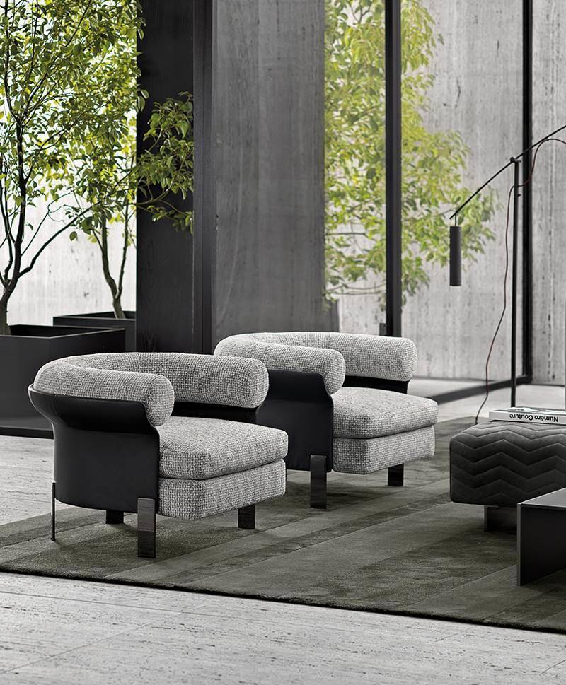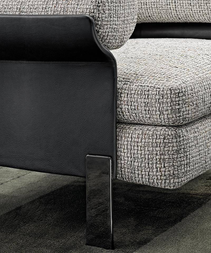 Conceived as precious details to streamline and lighten the design, the steel feet jetting out from underneath sport a Black-Nickel finish. The swivel base of the lounge armchair is available in the same finish.