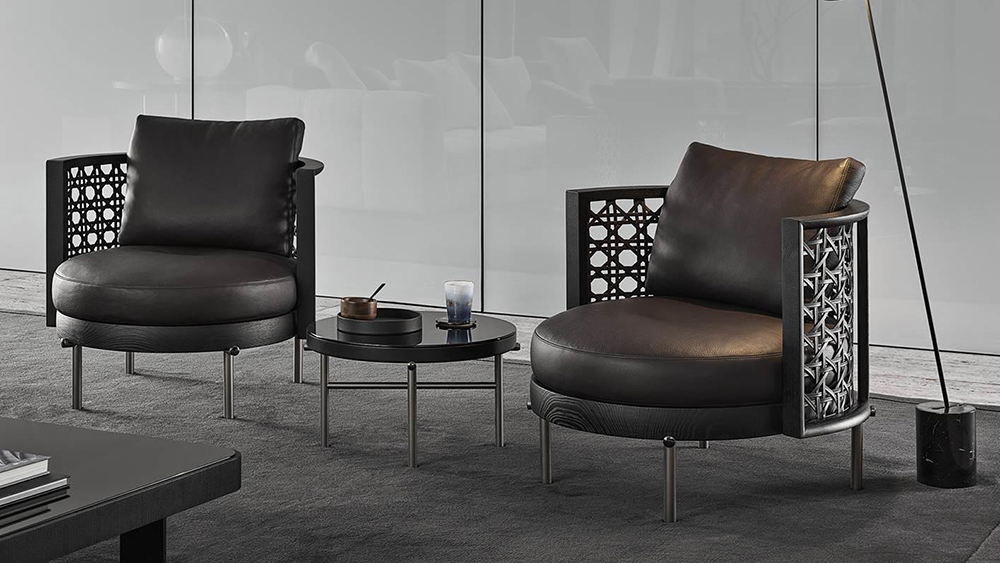 The seats can be accessorized with leather magazine caddy, crafted with fine luggage-crafting techniques and enriched with the same metal details as the base. The end of the horizontal metal element of the legs is designed so that it almost holds the backrest and seat, recalling the Kigumi technique, borrowed from the Japanese tradition of wood construction. A small decorative disk with Black-Nickel finish, in the form of a jewel-like button located at the end, adds a precious detail to the ensemble, and creates a series of contrasts with the Bronze colour varnished metal finish of the legs.