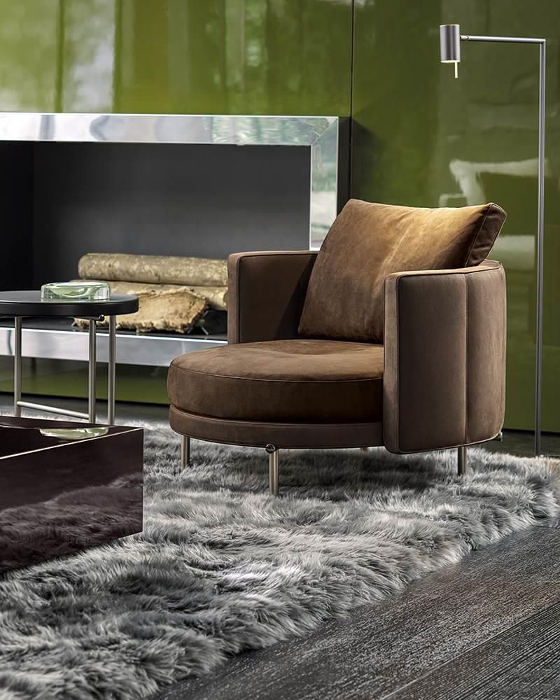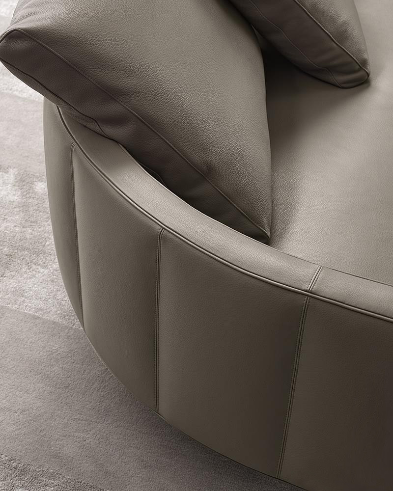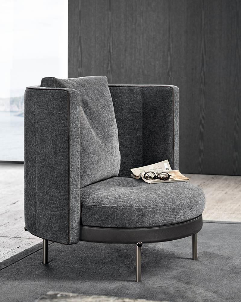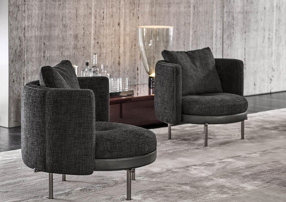 The armchairs and swivel armchairs in the form of a perfect circle were designed to meet a variety of requirements, both in terms of functionality and ergonomics, available in a range of different types. The seats - in the Bergère, Large, Medium and Small versions - and the Dining, Dining Large and Lounge little armchairs are the result of the in-depth research carried out to find the best way to express the sophisticated simplicity of the craftsmanship. The base is available in leather or fabric.