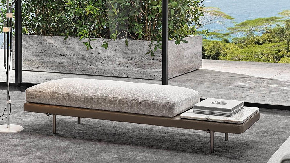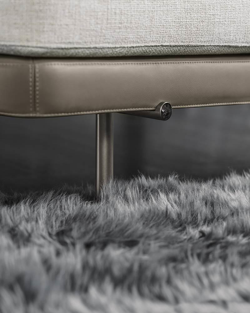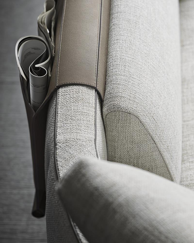 The slim backrest features vertical quilting and a piping running along the perimeter of the cushioning, underlining the couture quality of the craftsmanship. The eco-leather and eco-nubuck piping is in a slightly contrasting colour, but in the same shade as the fabric, if combined with a textile covering, whereas the leather versions come in the same shade when combined with leather upholstery. All the upholstered elements of the system can be customized by choosing the covering: 100% fabric or leather, or in fabric with a leather base.