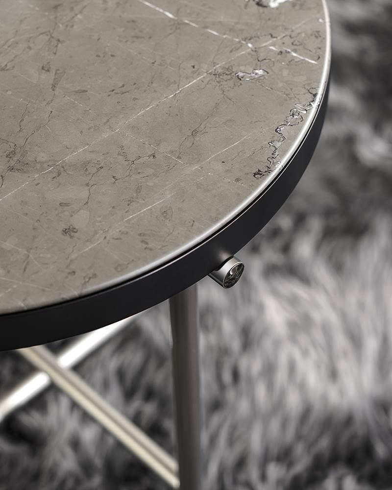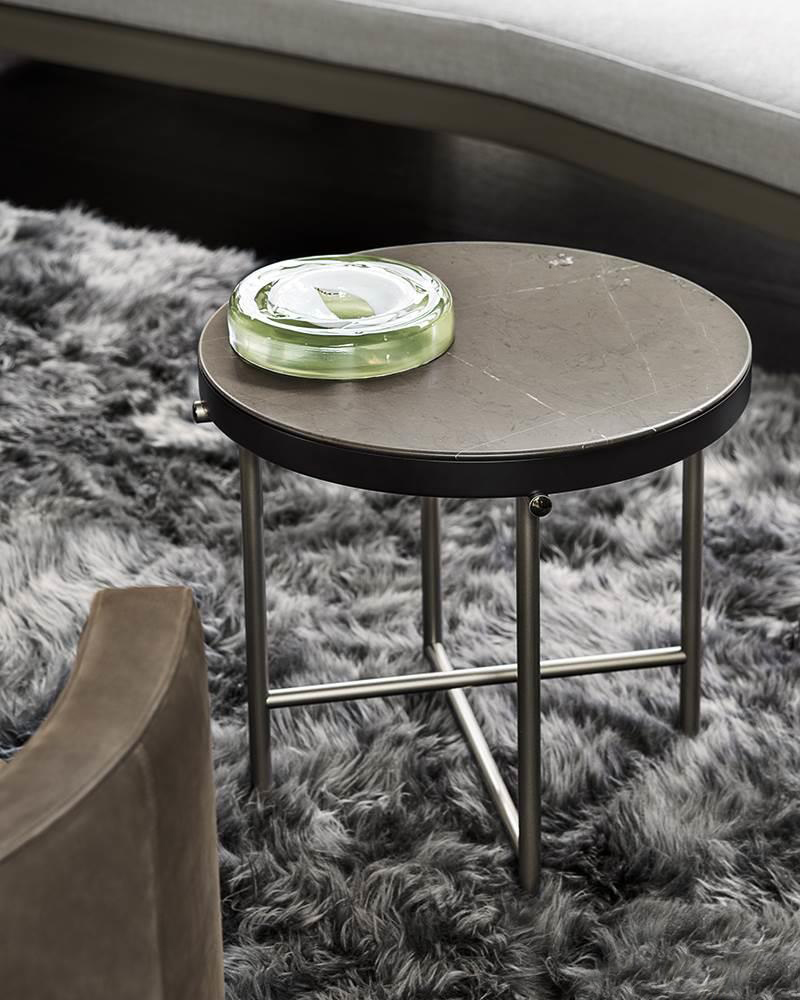 The extension of the base of some elements features a top in Calacatta or Stone Grey marble with a matt polyester lacquer finish, crafted with a careful study of its proportions, thickness and structural details so that it blends seamlessly into the seat, also from an aesthetic point of view.