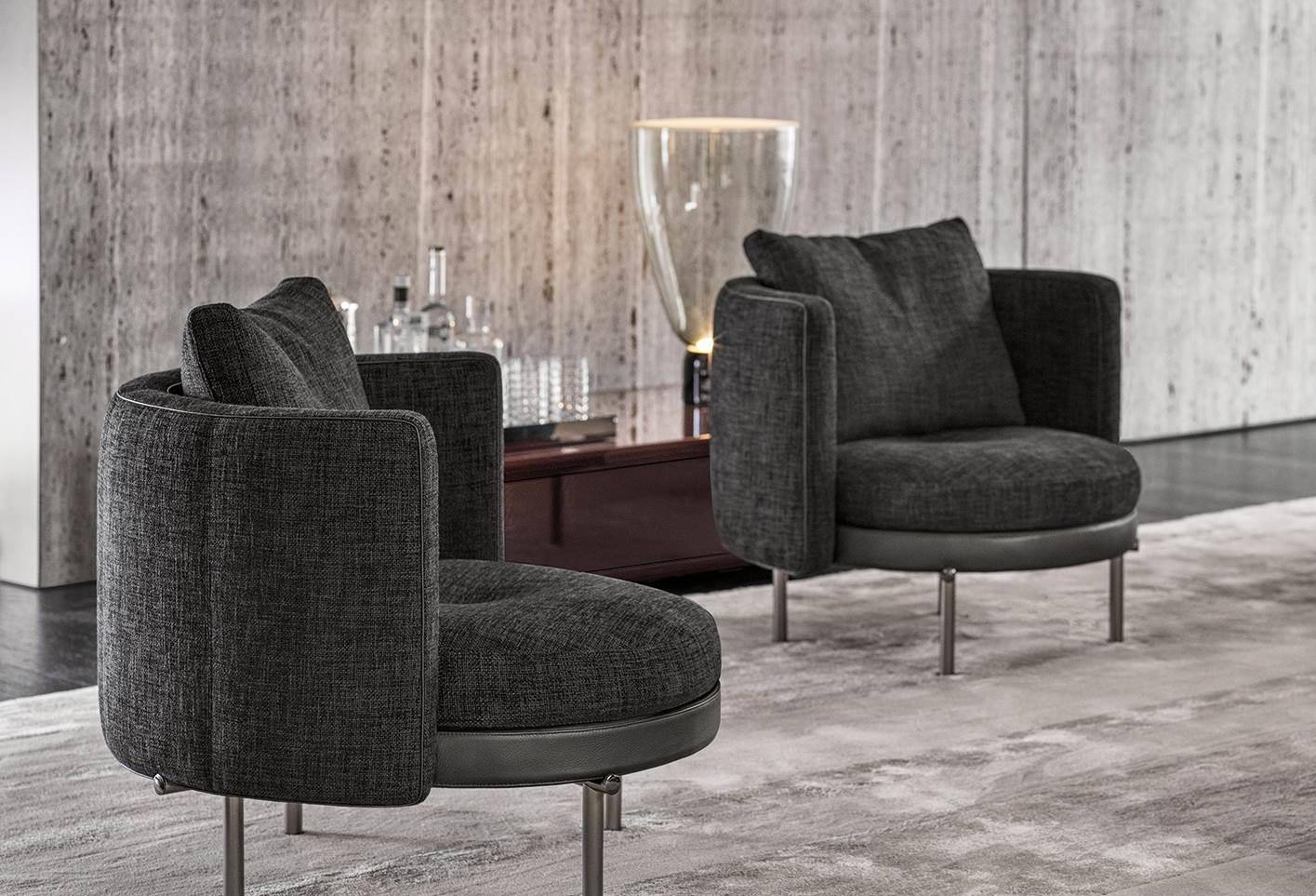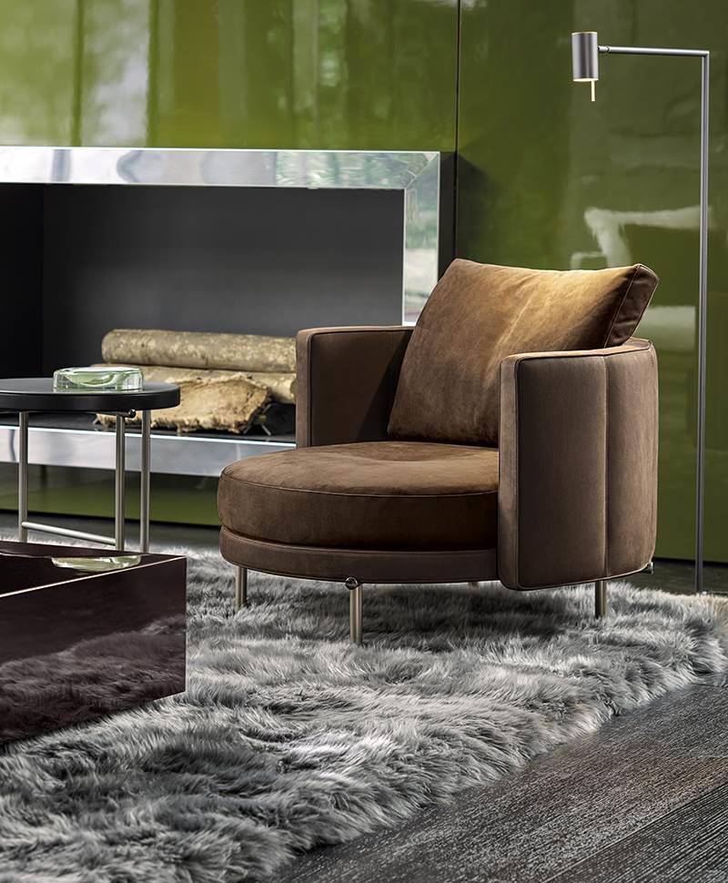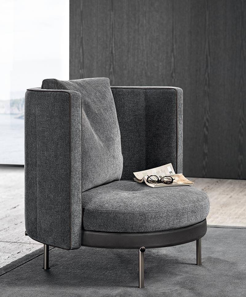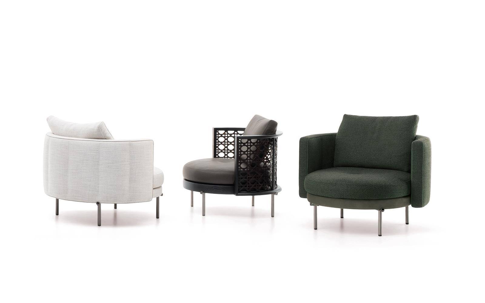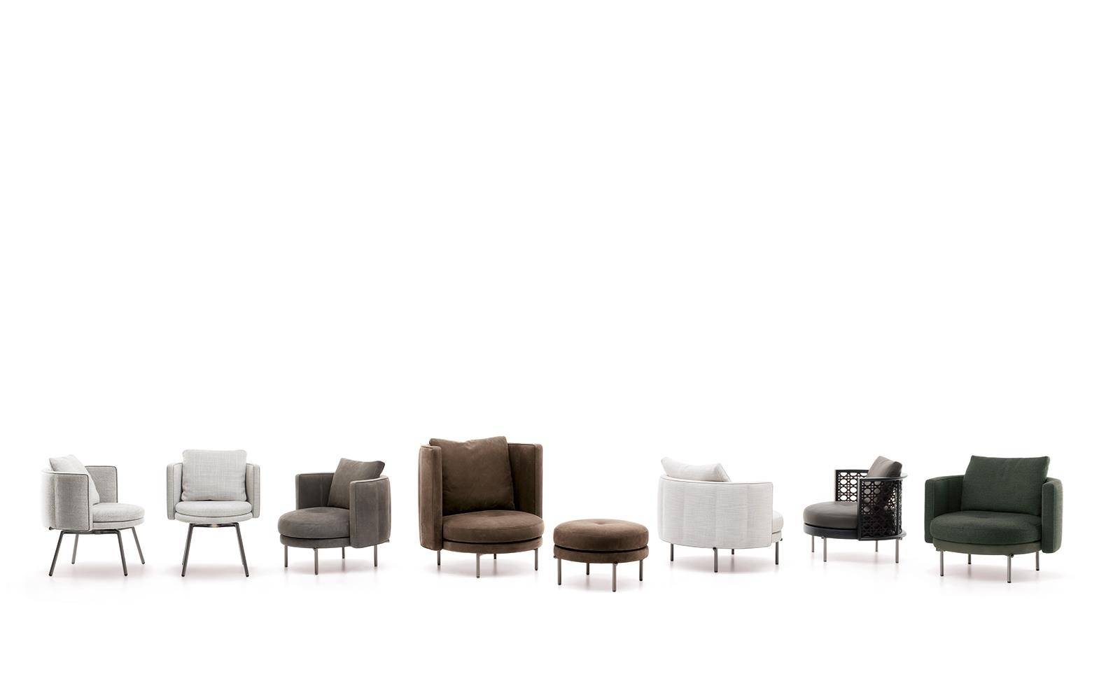 The armchairs and swivel armchairs in the form of a perfect circle were designed to meet a variety of requirements, both in terms of functionality and ergonomics, available in a range of different types. The seats - in the Bergère, Large, Medium and Small versions - and the Dining, Dining Large and Lounge little armchairs are the result of the in-depth research carried out to find the best way to express the sophisticated simplicity of the craftsmanship. The base is available in leather or fabric.