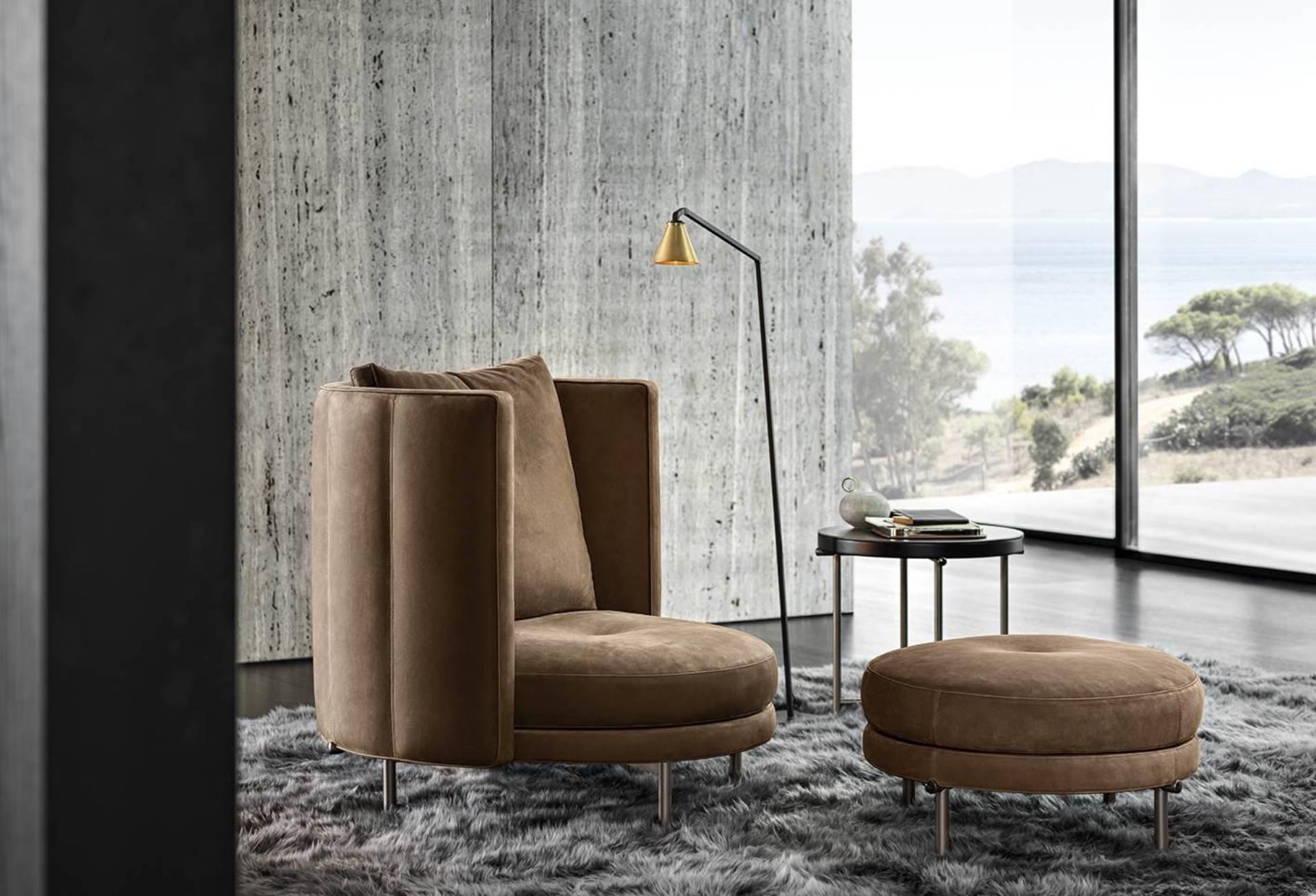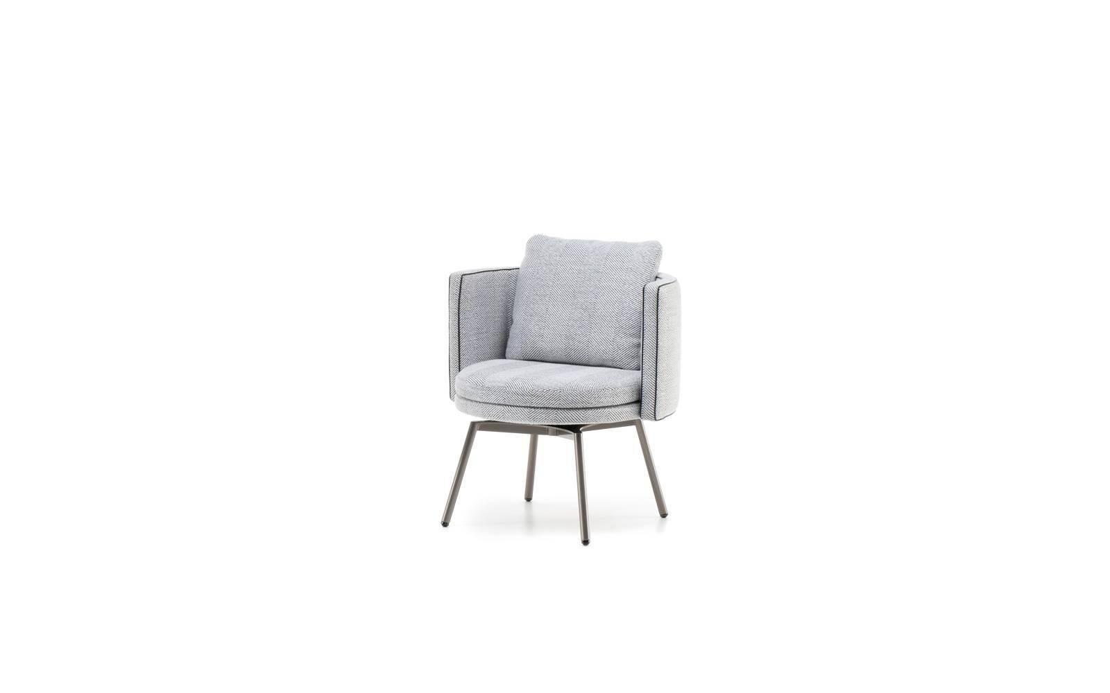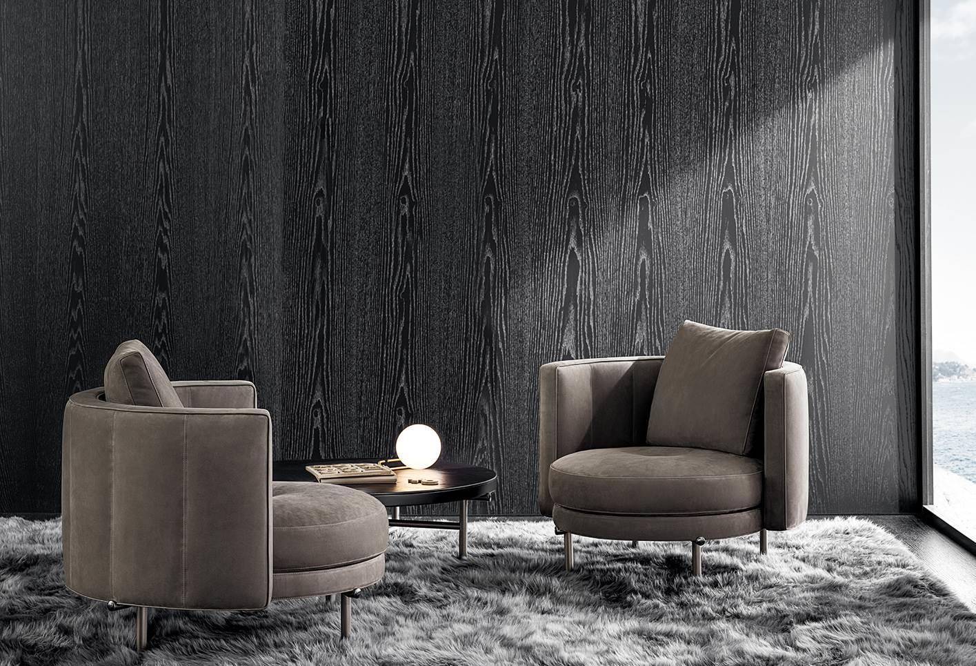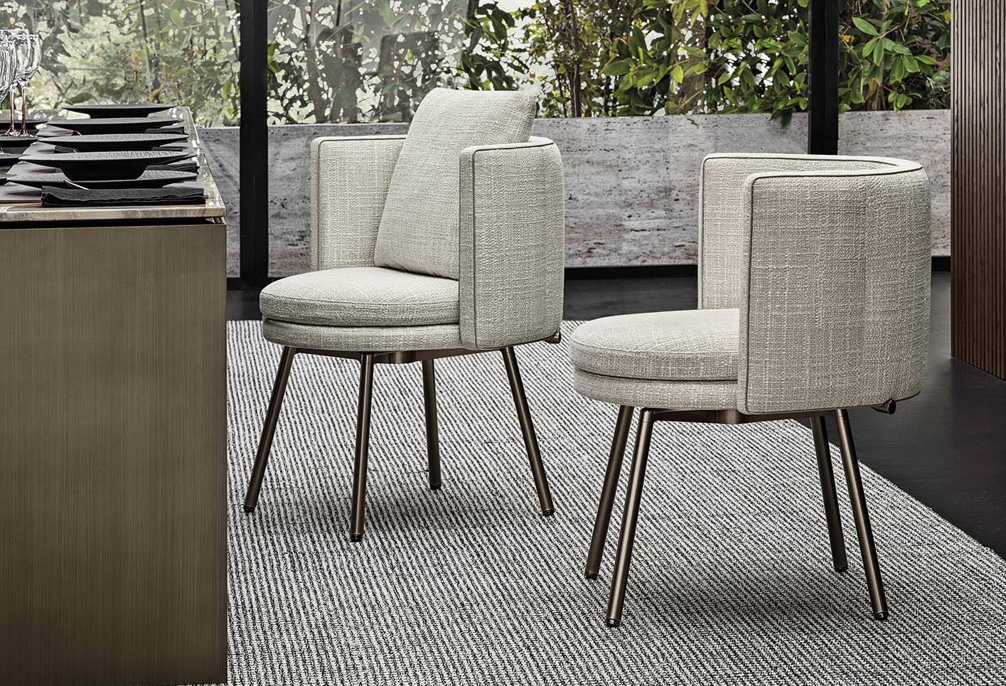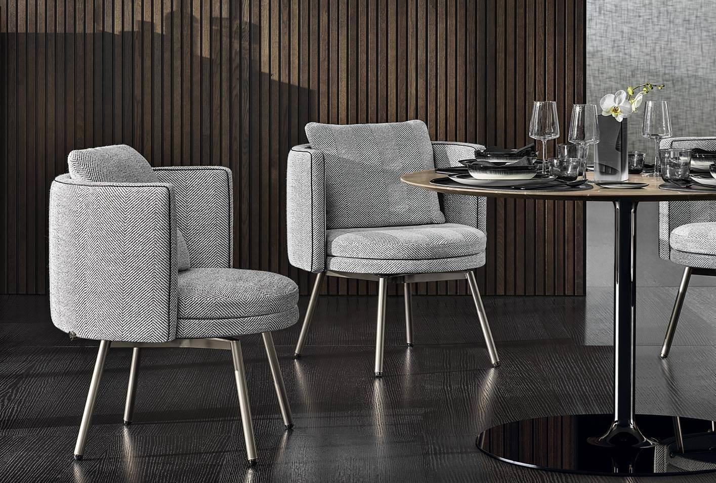 The armchairs and swivel armchairs in the form of a perfect circle were designed to meet a variety of requirements, both in terms of functionality and ergonomics, available in a range of different types. The seats - in the Bergère, Large, Medium and Small versions - and the Dining, Dining Large and Lounge little armchairs are the result of the in-depth research carried out to find the best way to express the sophisticated simplicity of the craftsmanship. The base is available in leather or fabric.