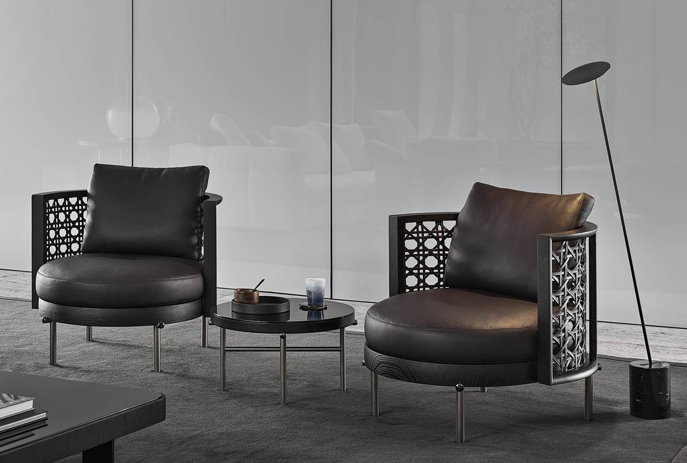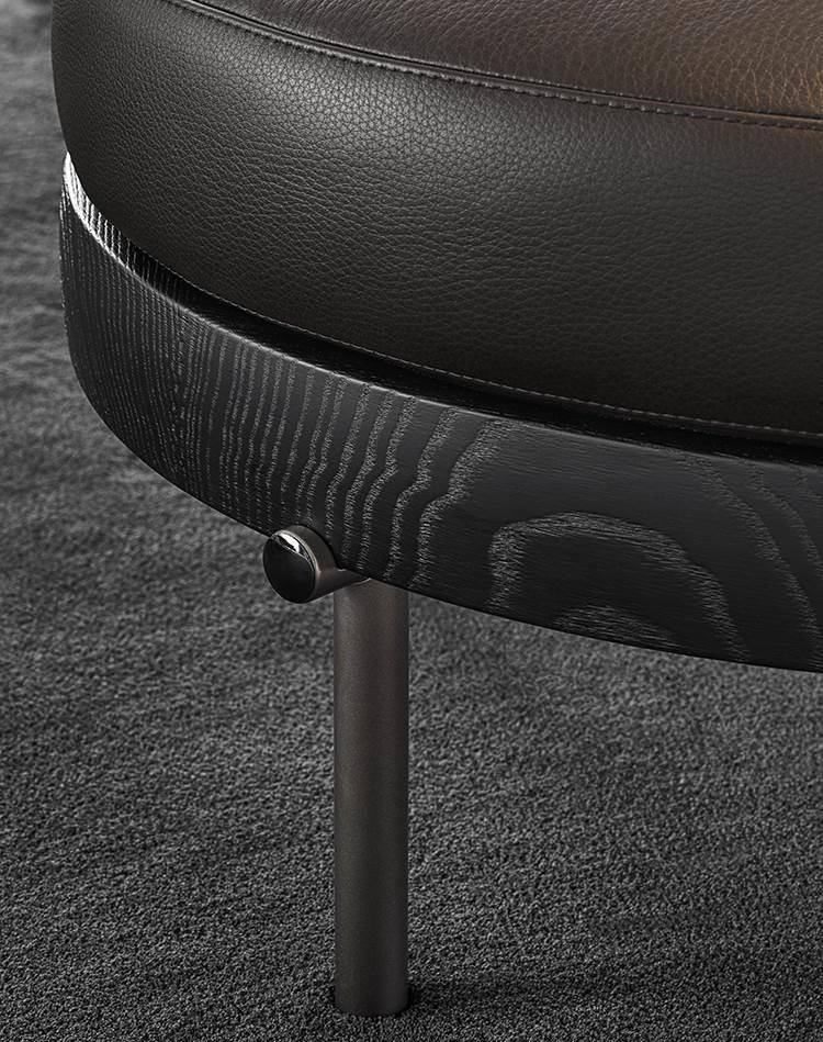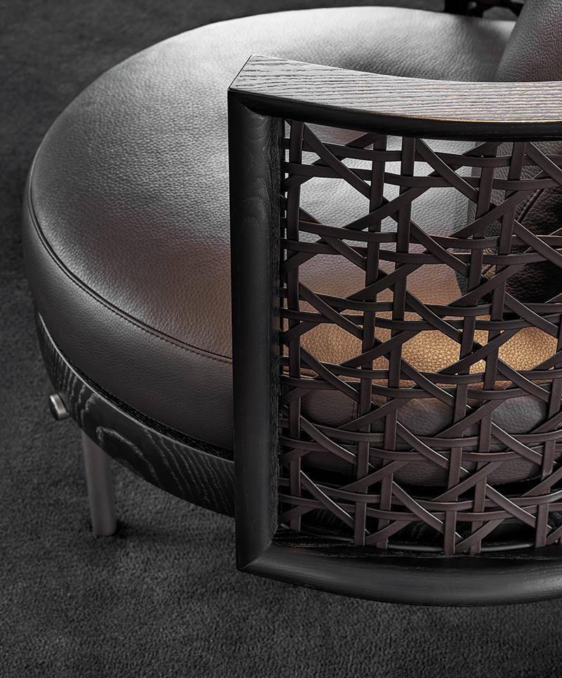 The seats can be accessorized with leather magazine caddy, crafted with fine luggage-crafting techniques and enriched with the same metal details as the base. The end of the horizontal metal element of the legs is designed so that it almost holds the backrest and seat, recalling the Kigumi technique, borrowed from the Japanese tradition of wood construction. A small decorative disk with Black-Nickel finish, in the form of a jewel-like button located at the end, adds a precious detail to the ensemble, and creates a series of contrasts with the Bronze colour varnished metal finish of the legs.