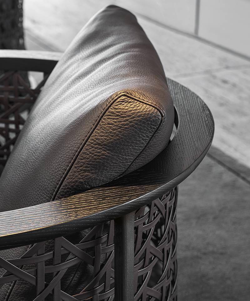 The Small armchair is also available in the Torii Nest version with braided leather backrest and a pattern inspired by Vienna straw, inserted in a solid ash wood frame that sits on a base in the same material.