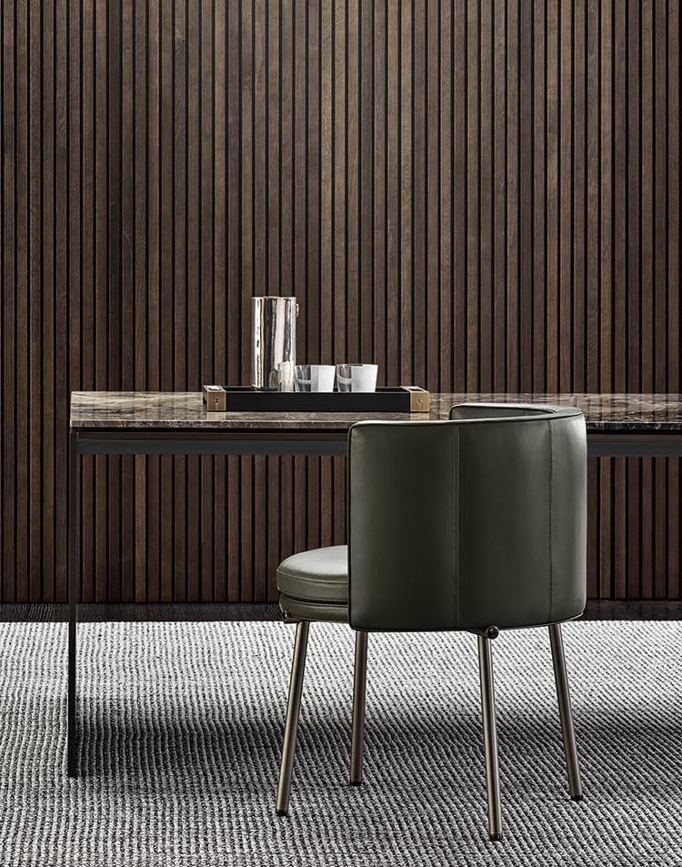 The slim backrest features vertical quilting and a piping running along the perimeter of the cushioning, underlining the couture quality of the craftsmanship. The eco-leather and eco-nubuck piping is in a slightly contrasting colour, but in the same shade as the fabric, if combined with a textile covering, whereas the leather versions come in the same shade when combined with leather upholstery. All the upholstered elements of the system can be customized by choosing the covering: 100% fabric or leather, or in fabric with a leather base.