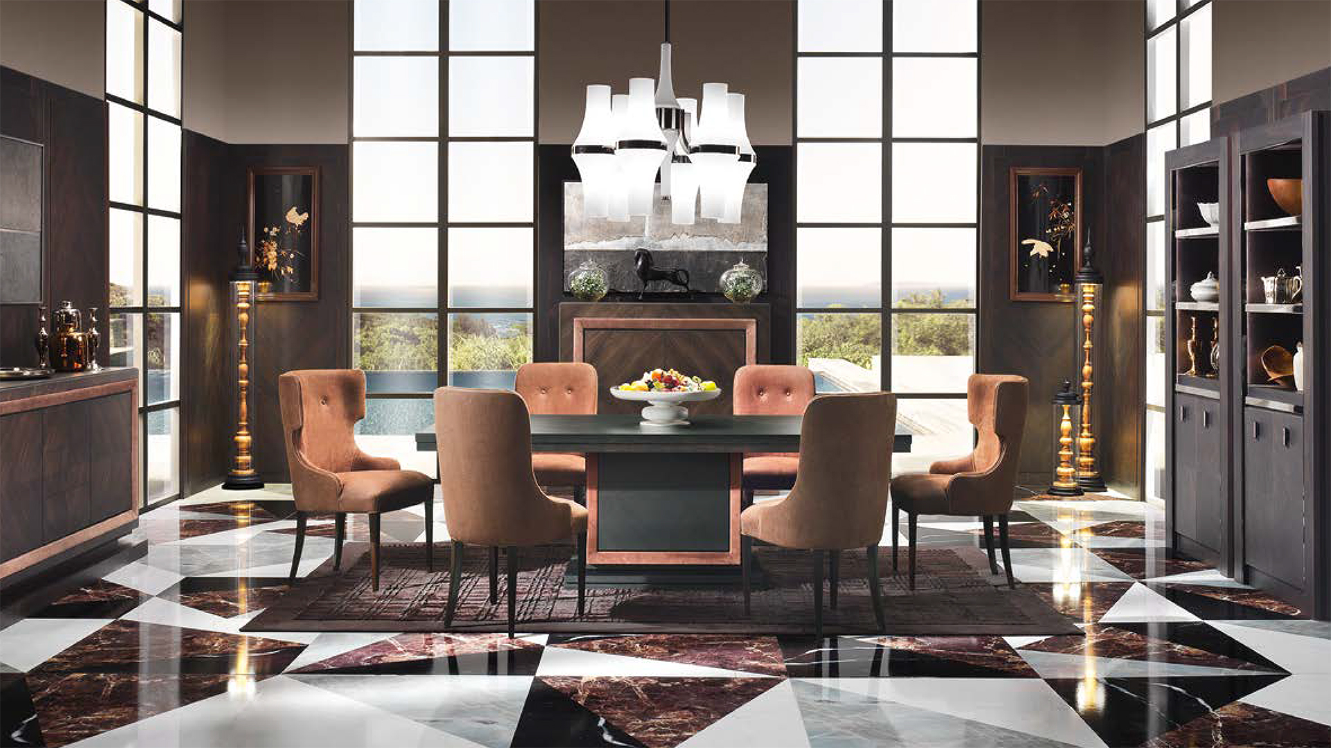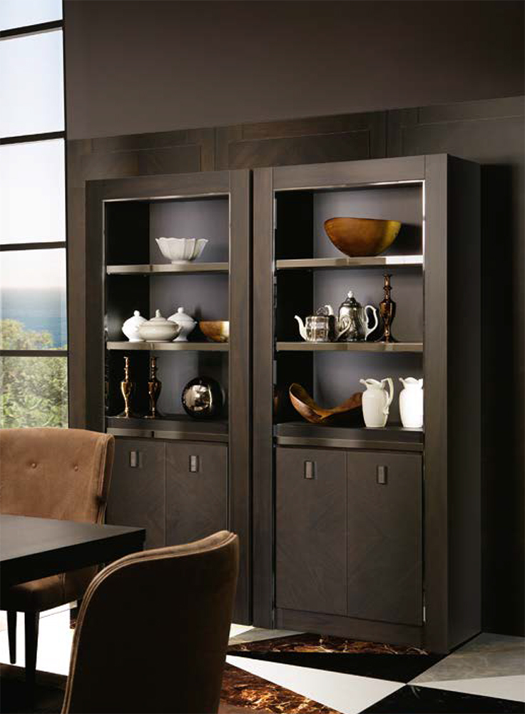 Duke is chiseled elegance, illuminated by metal details and leather inserts. This bookshelf can be placed both in a design office as well as modern and classic living rooms. Ornaments and books find their place on its luminous shelves and acquire a new charm.