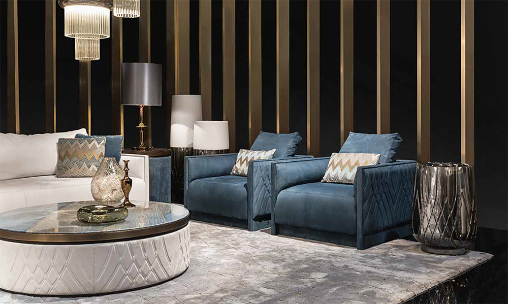 However, beside the exclusiveness of the marble, the white leather upholstering the structure has another exclusive peculiarity: it is crossed by sinuous lines that create the typical soft Jersey pattern of the Contrast product line.