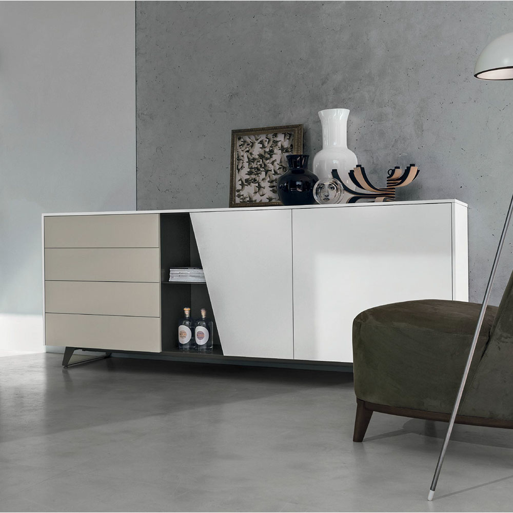 The diagonal cut-out creates open shelving for showcasing favourite objects. The sideboard features a wealth of practical storage and display solutions.