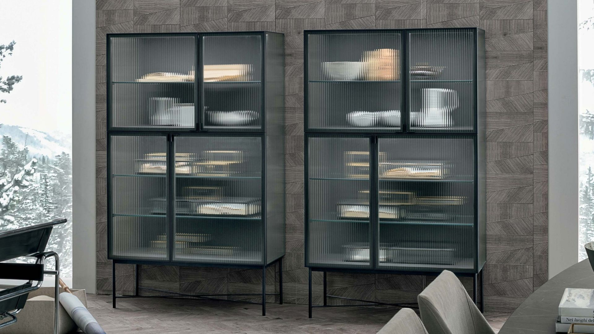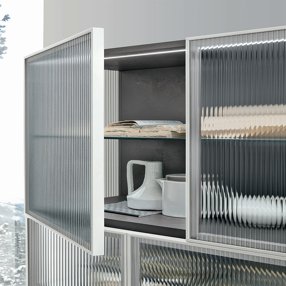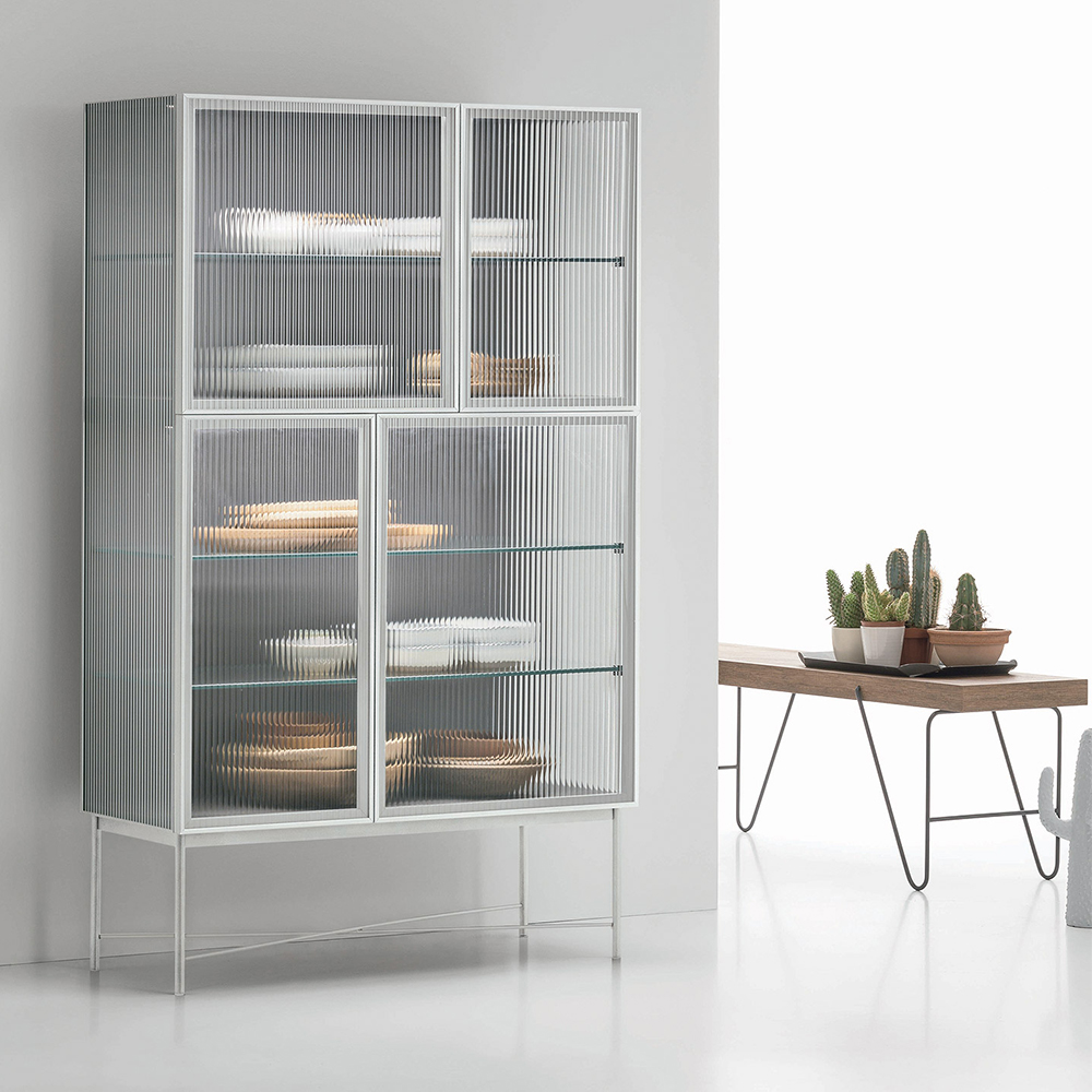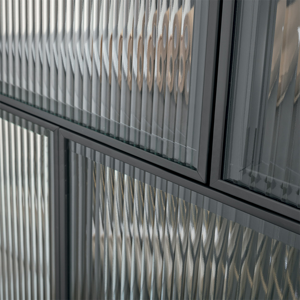 Nina sideboard. The metal structure and reeded glass distinguish the Nina sideboard, turning it into a vintage-style glass display cabinet.