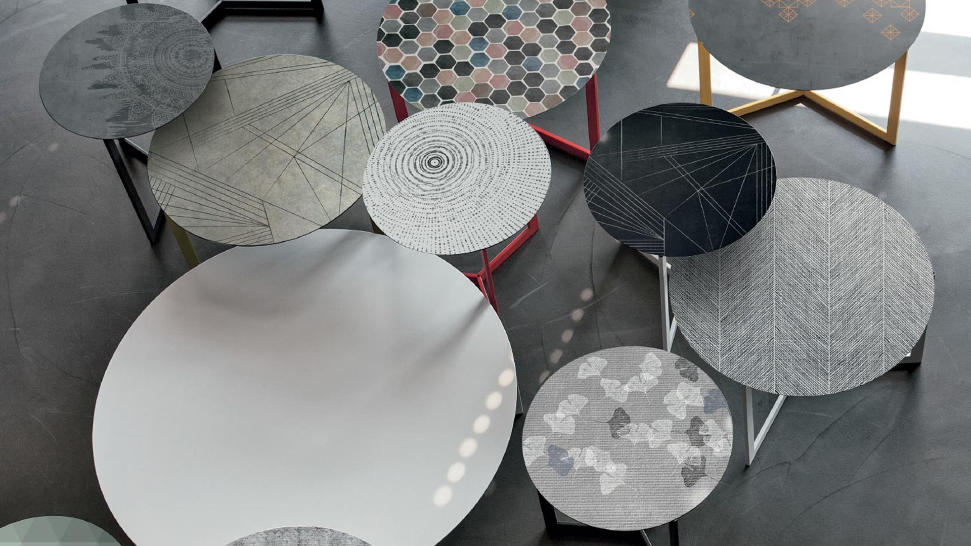 Round screen-printed occasional table for living rooms.