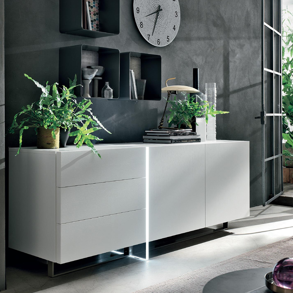 The LED technology offers a novel take on classic home furnishings: in the MADISON sideboard, the coloured light detail highlights the design of this timeless item, shifting from magenta to cyan to green to create special effects in perfect harmony with both living and bedroom areas.