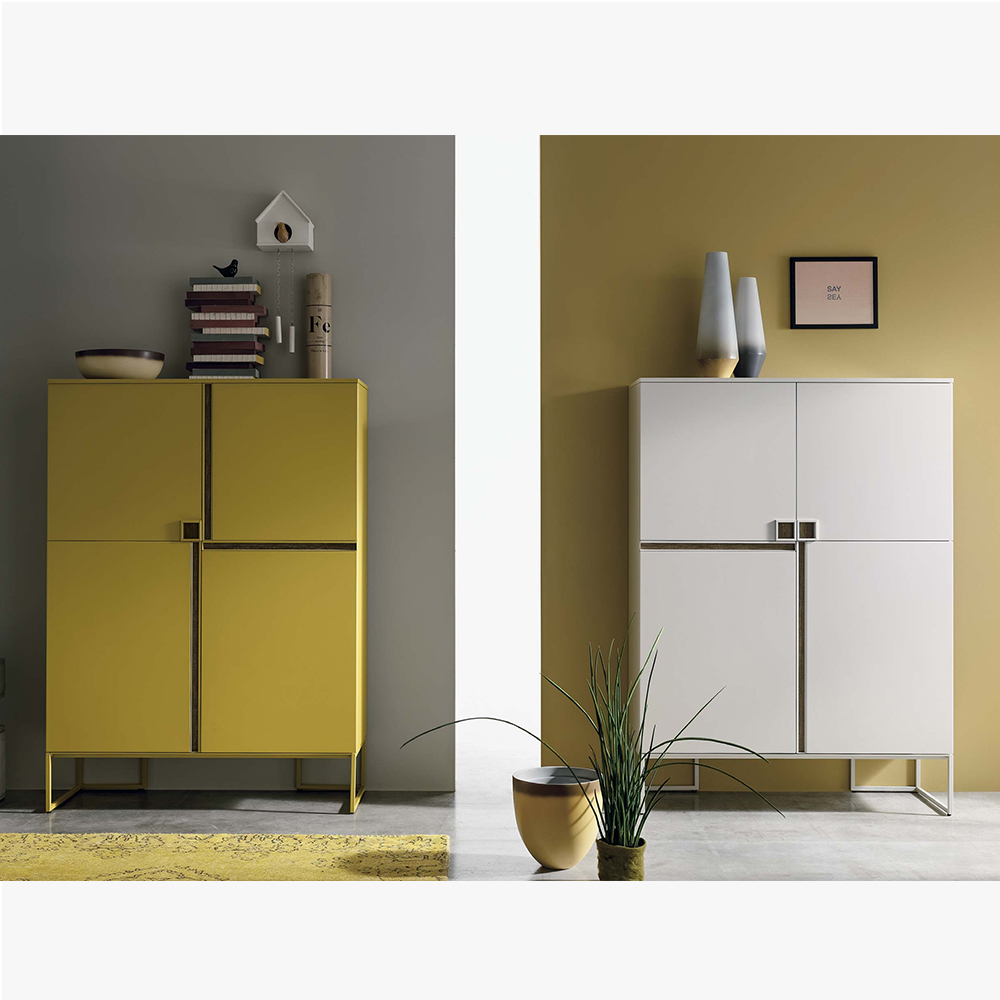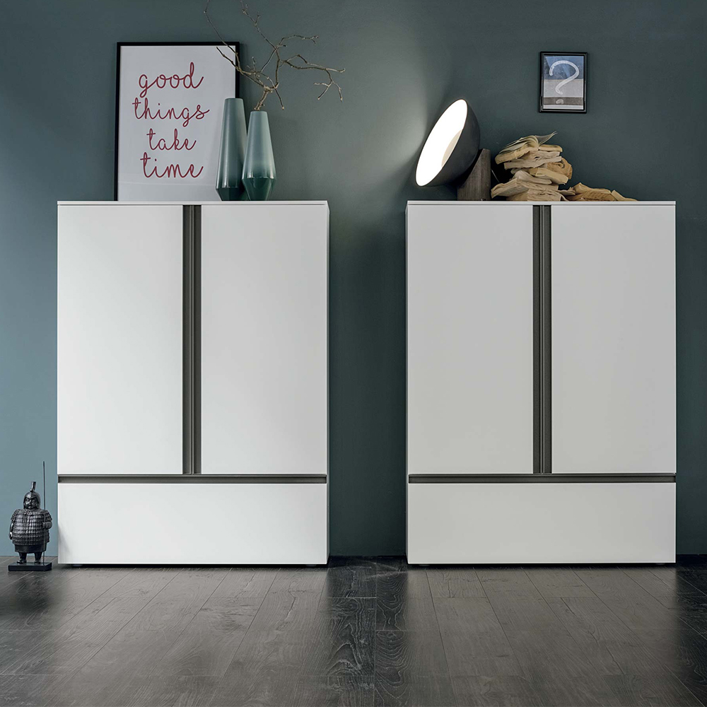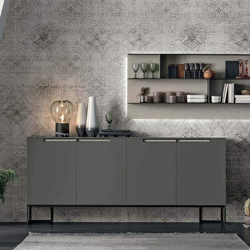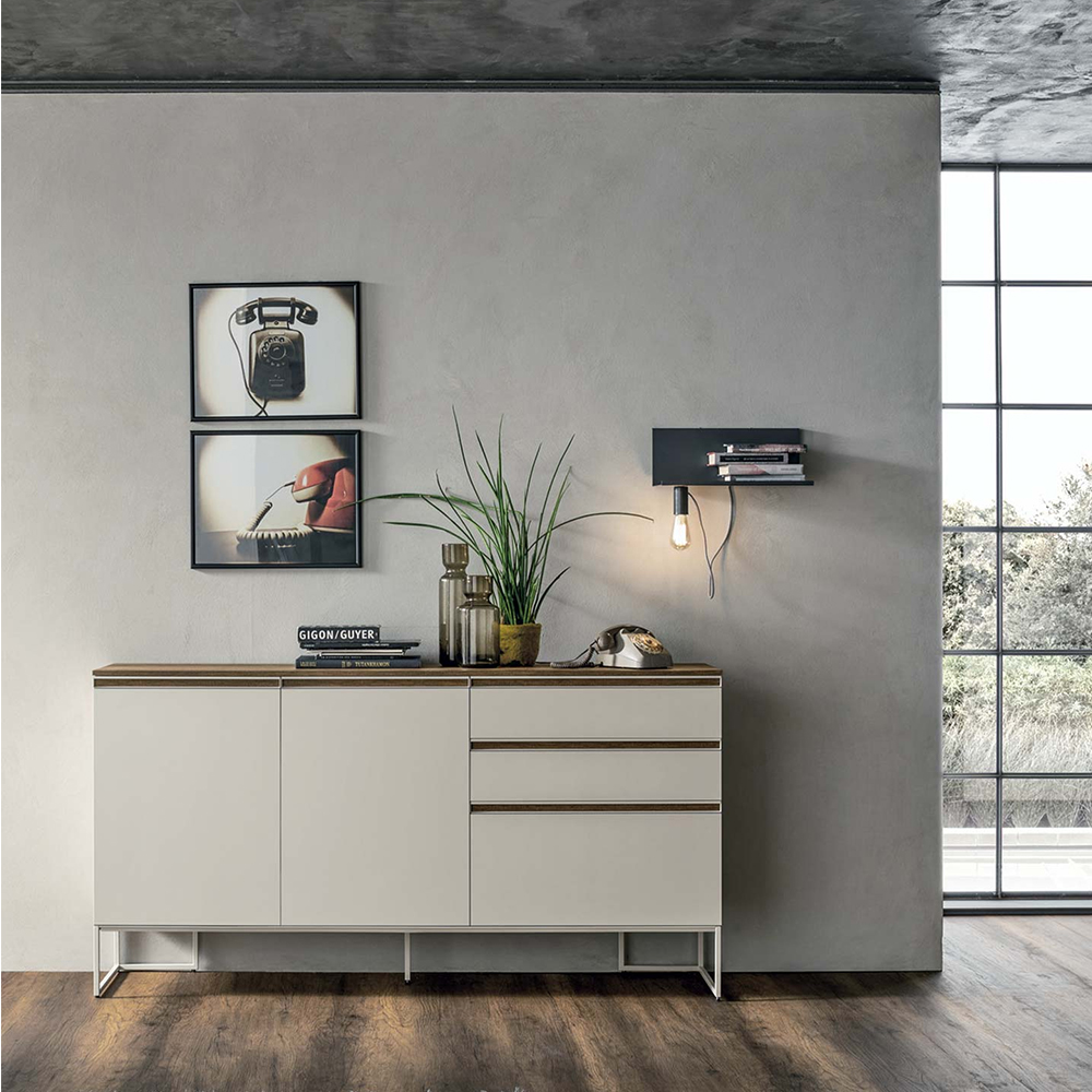 Regolo sideboard with a textured matt chalk white carcass, a textured eastern ash insert and anthracite 160 metal base.