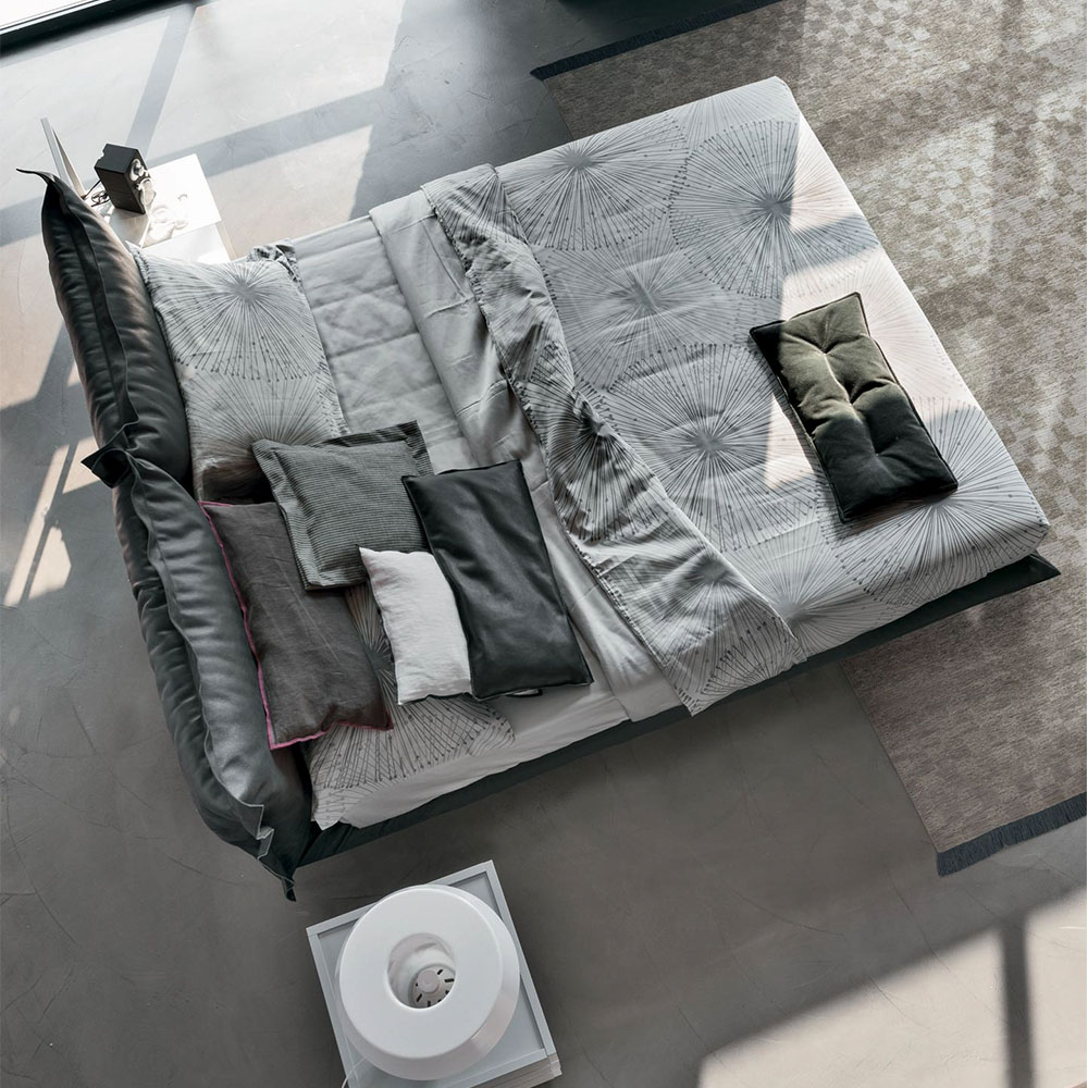 The two, soft, frilled headboard cushions give the bed a young, fresh appeal. It brings to mind a cloud with wavy, irregular edges, that constantly change shape. Just perfect for genuine dreamers.