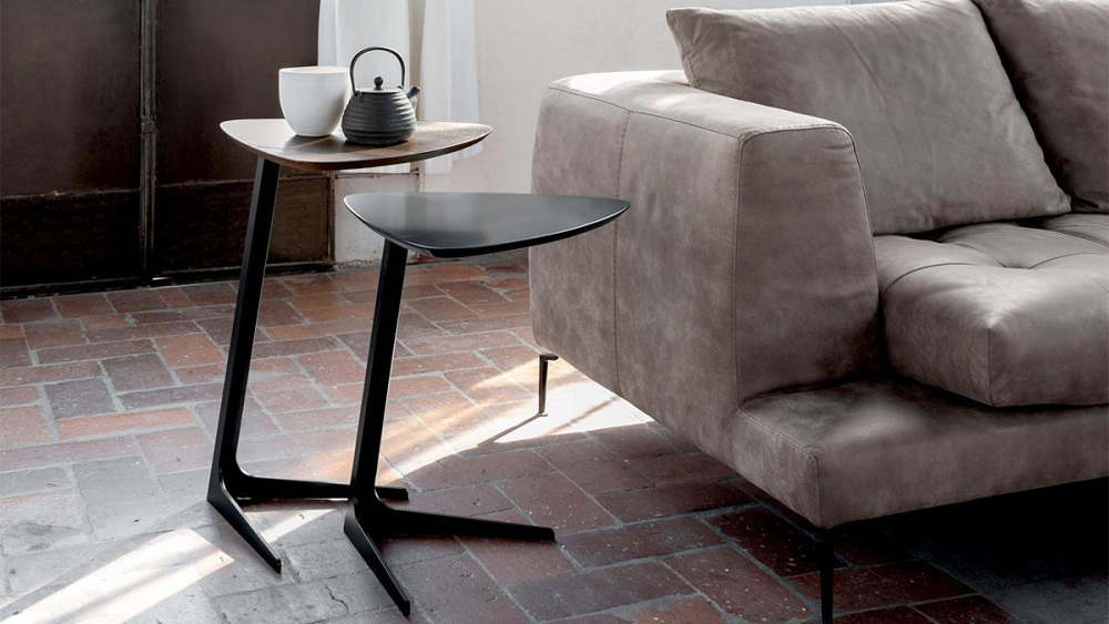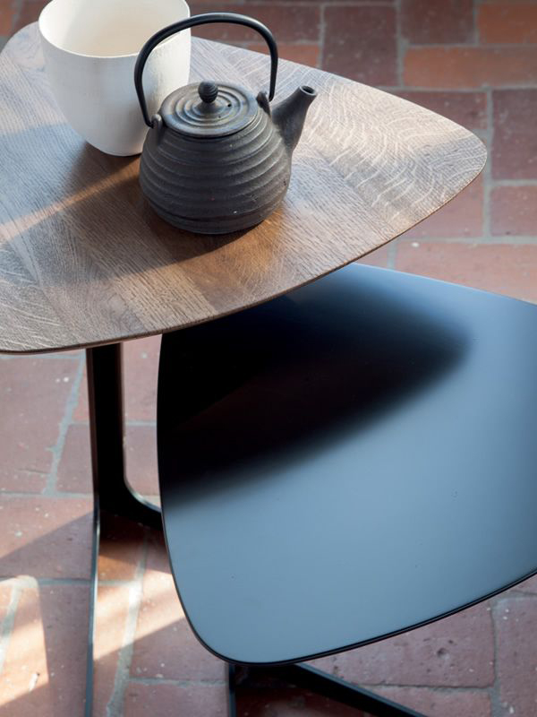 A small coffee table, with a three-sided top, put on a varnished metal trivet. We balanced colors and materials, placidly: a solid, natural or lacquered chestnut oak, on a matt black base; matt white lacquered MDF top, on a matt white base.