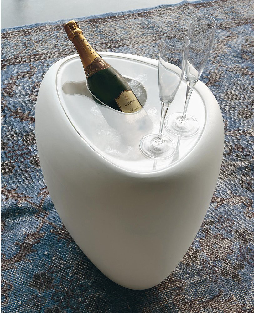 Innovative in both design and manufacture (the polyethylene mold), IOS comes to life in its own color variations, in the structure, in the perspex, or wooden top, and in the bottle-holder version.