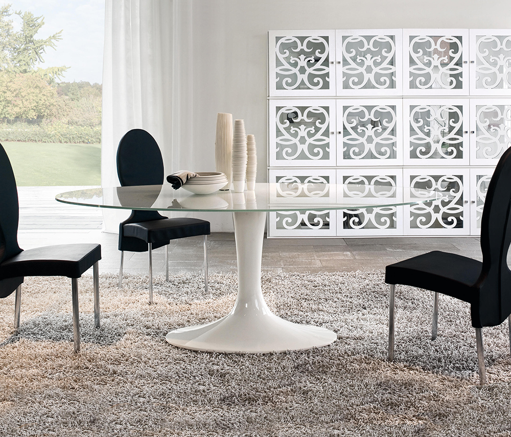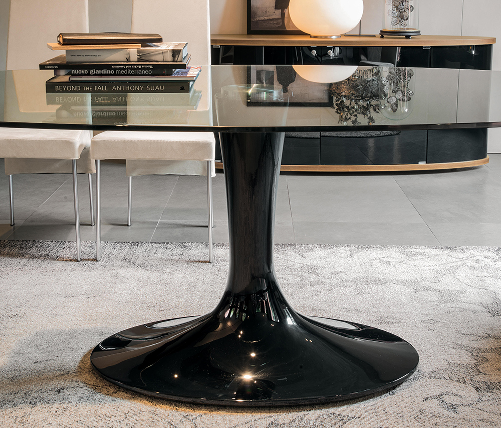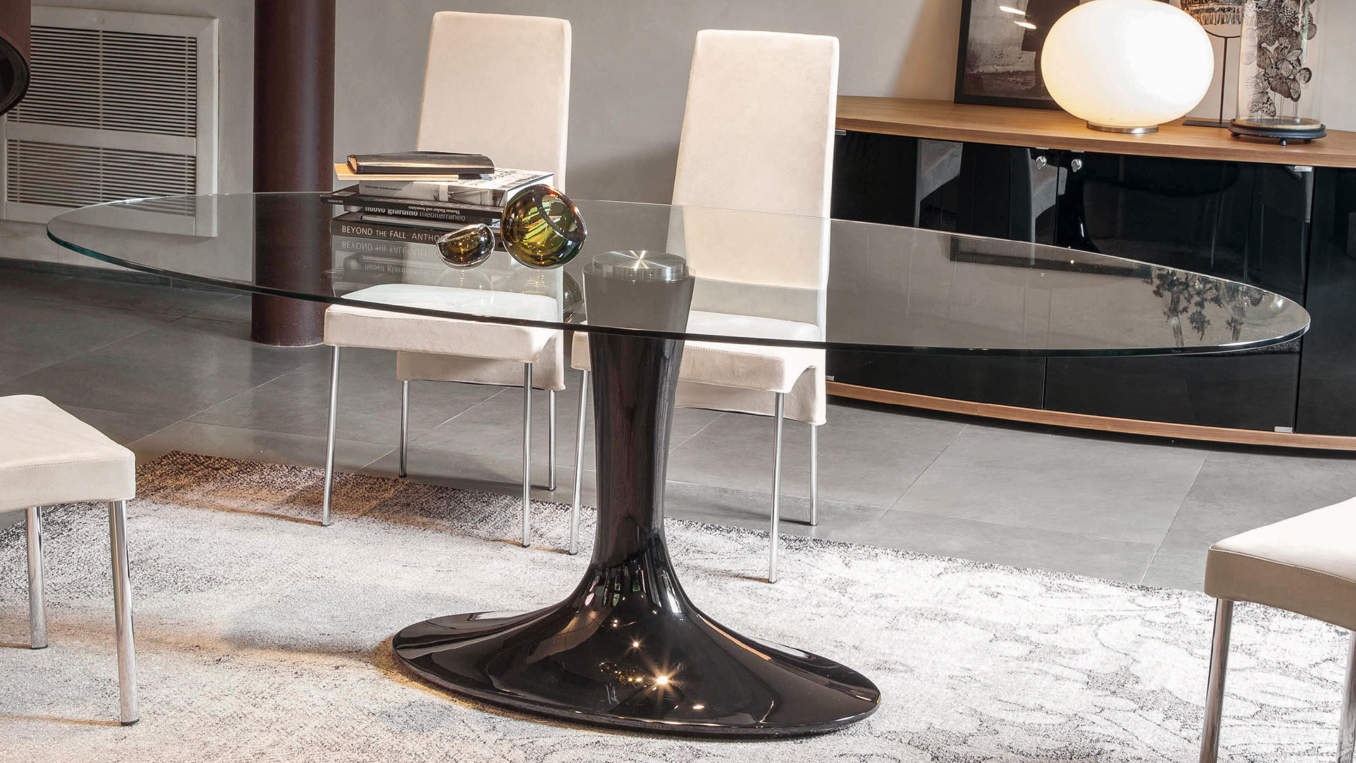 Imperial table grows like an oval-based stem: it thickens on the ground, and gets thinner as it goes up, shaping a perfect balance between empty spaces and material. The shiny cultured marble - the base - marries different finishes of tempered glass and porcelain stoneware - the top.