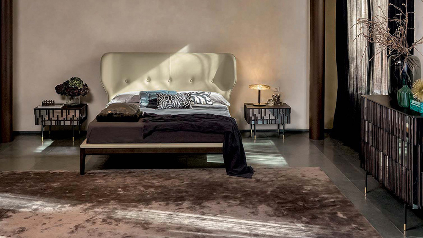 A complete and extremely elegant night group. Solid wood drops applied with extreme care to the mirror effect doors. A fine and sophisticated shaped and rounded top; a metal frame with gold-finish insert. All this to leave nothing randomly.