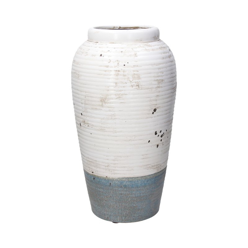 A ceramic vase from the Stintino line by Tognana is finished with a specially aged white and blue glaze. With its surface and feminine shape, this vase will give your room an elegant look.