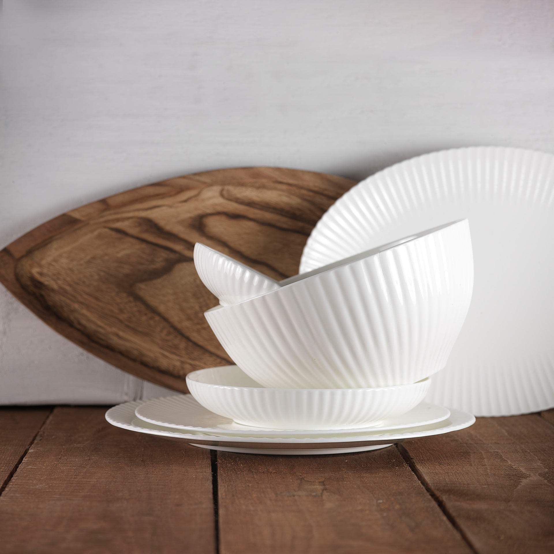 The modern finishes of the Radius collection in real bone china can bring the elegance and carelessness of the moment to your tables.