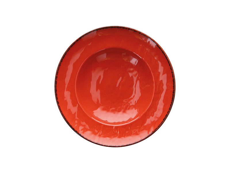 The Vulcania line surprises with rich colors inspired by the natural hues of fruits and vegetables. This plate is presented in orange color with a dark brown border.