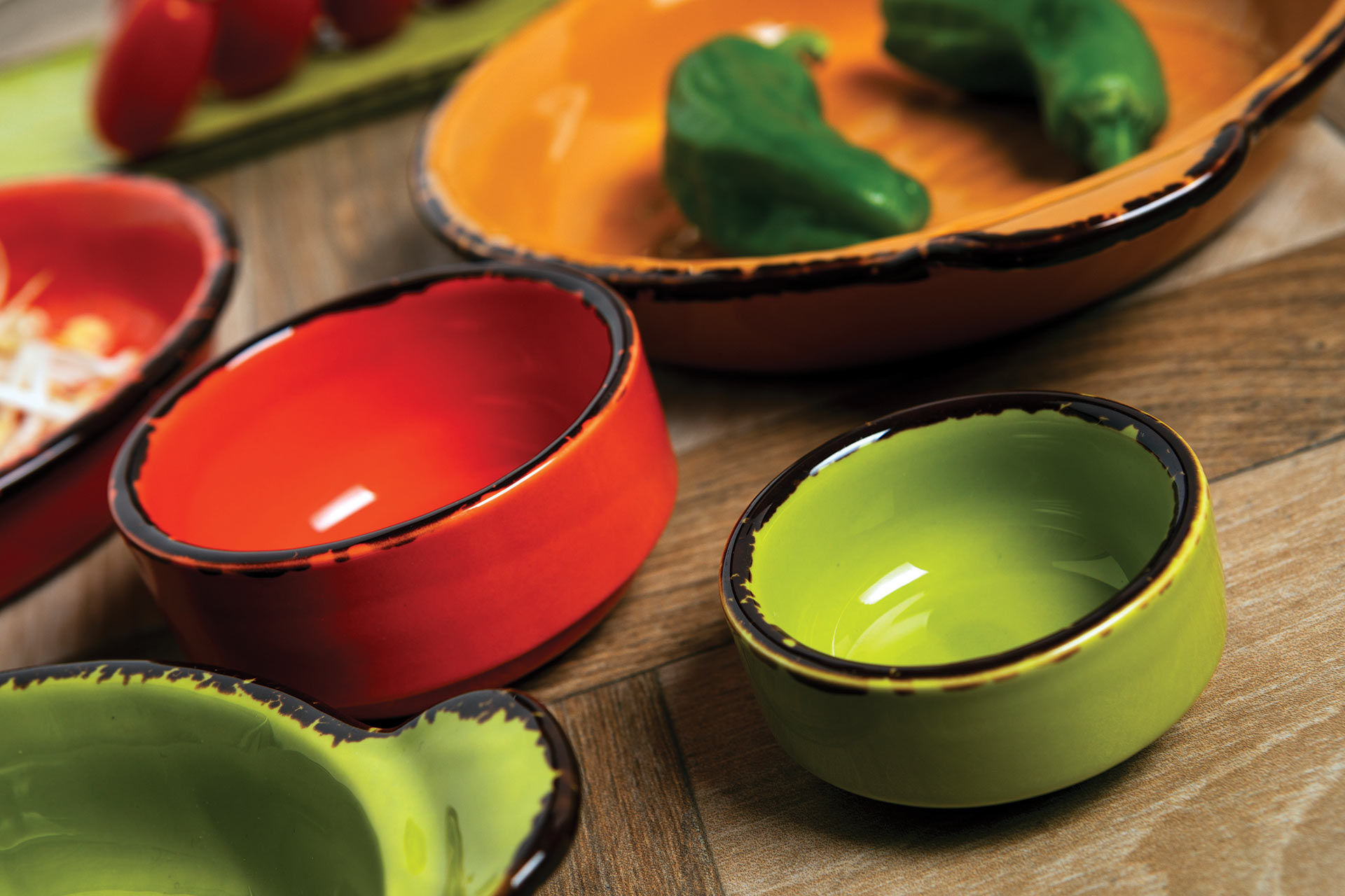 The Vulcania Veggie range surprises with rich colors. Shades are inspired by nature, namely the 3 stages of ripening of fruits and vegetables. The collection is available in 3 colors: green, yellow and orange, all with a brown border. Aesthetics is not the only important aspect of the Vulcania Veggie line. The range has increased strength due to high-quality porcelain, hardened at high temperatures.
