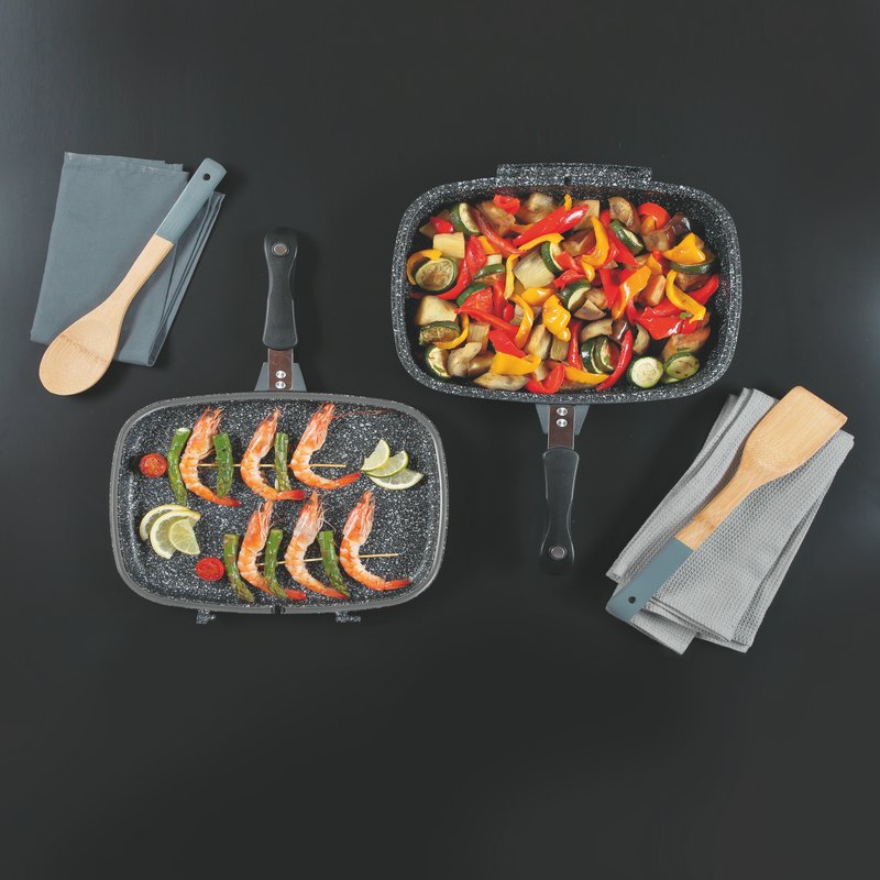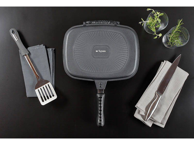 The Sphera Rectangular Double Sided Pan is therefore suitable for all cooking surfaces and also allows healthy and healthy cooking as it is nickel and PFOA free. The Soft Touch bakelite handle has an elegant, refined and patented design.