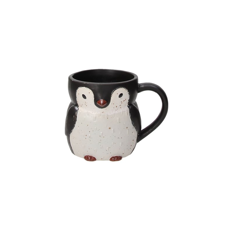 A cute face protrudes from a penguin-shaped ceramic mug.