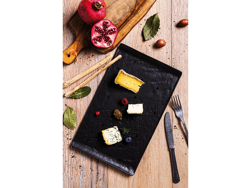 The plate of the Vulcania Black line is made of black paste porcelain with a lava stone finish. It is also highly resistant to time and damage.