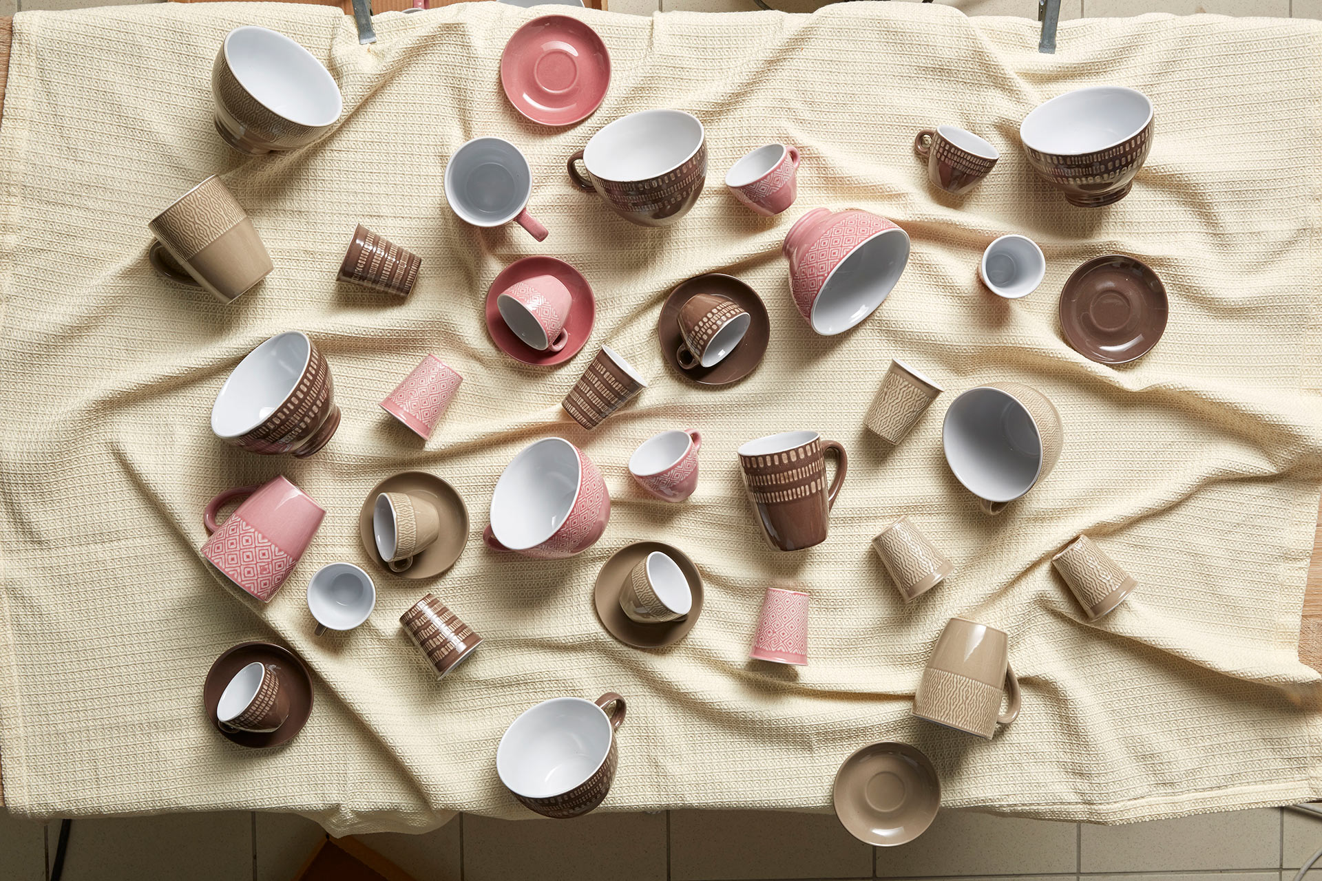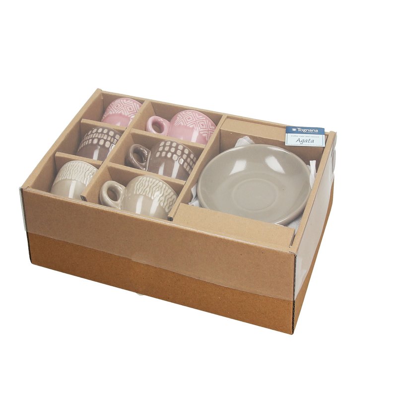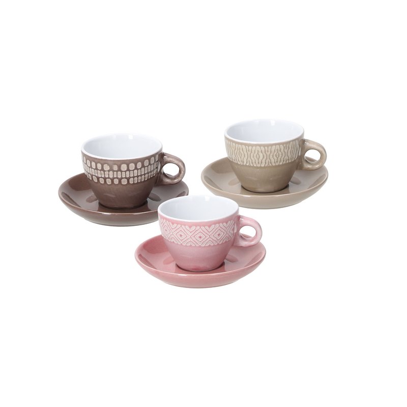 The coffee set of the Lapis Agata line consists of six cups with clay saucers. It features exquisite decor on brown, beige and pink backgrounds.