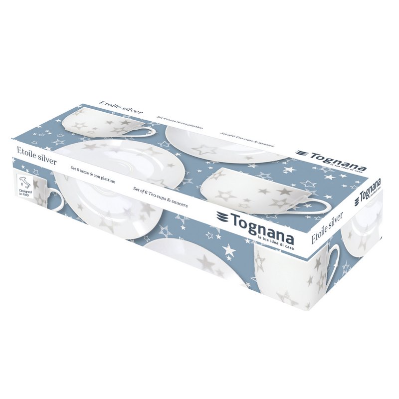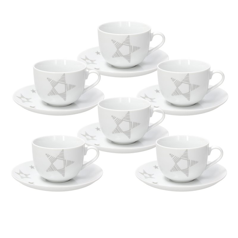 Made of high quality porcelain, this set of 6 tea cups with saucers is embellished with a galaxy of stars that will add shine and sparkle to your table.