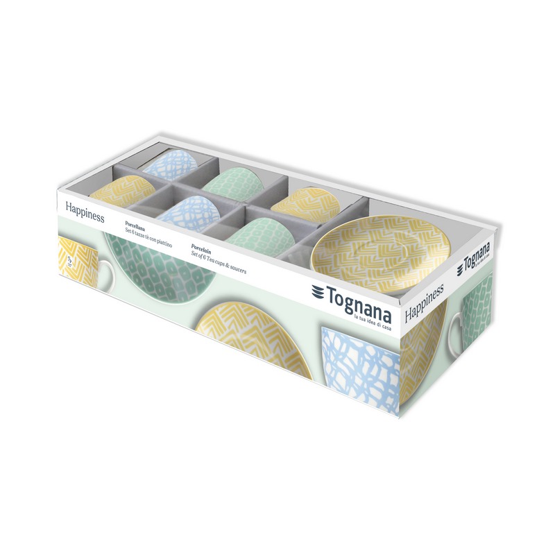 Treat yourself to Tognana`s original set of 6 Happiness tea cups and saucers.