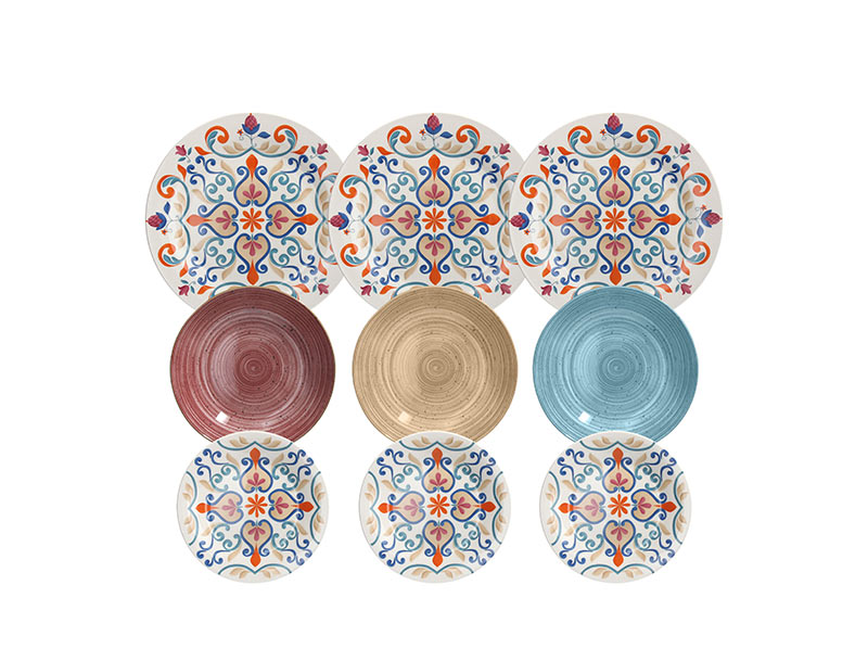 The 18-piece Sofil table service from the Moon line is made of porcelain in different colors with interspersed frames with a floral theme. This service, designed by Andrea Fontebasso, is decorated in shades from burgundy red to beige, reminiscent of the warm season and distant lands. Ideal for both everyday use and special occasions, it can be combined with a coordinated line of textiles to create a complete set.