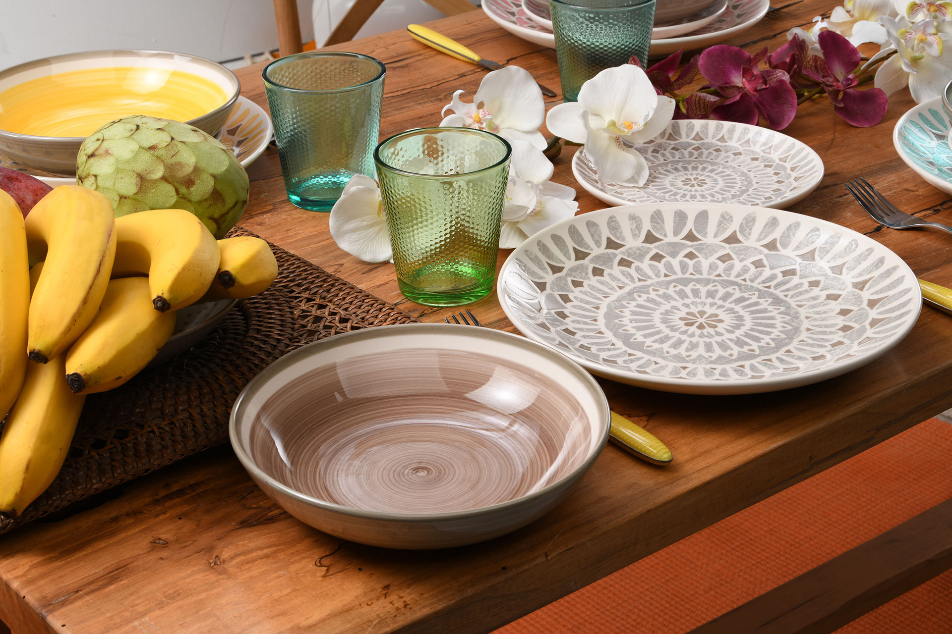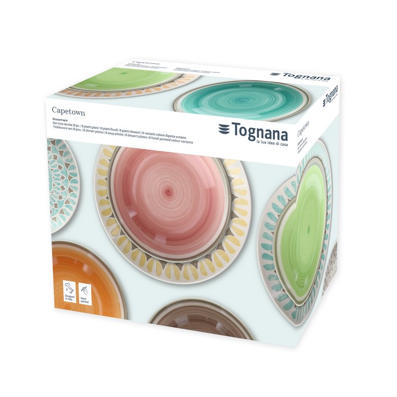 The Capetown table service is made of ceramic and has a trendy and eye-catching style thanks to the explosive number of colors and patterns present on each plate. Bright, colourful, functional, modern and stunningly lively, they challenge boring design and all black and white traditional tableware.