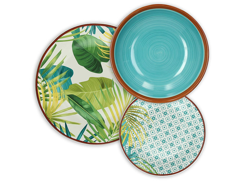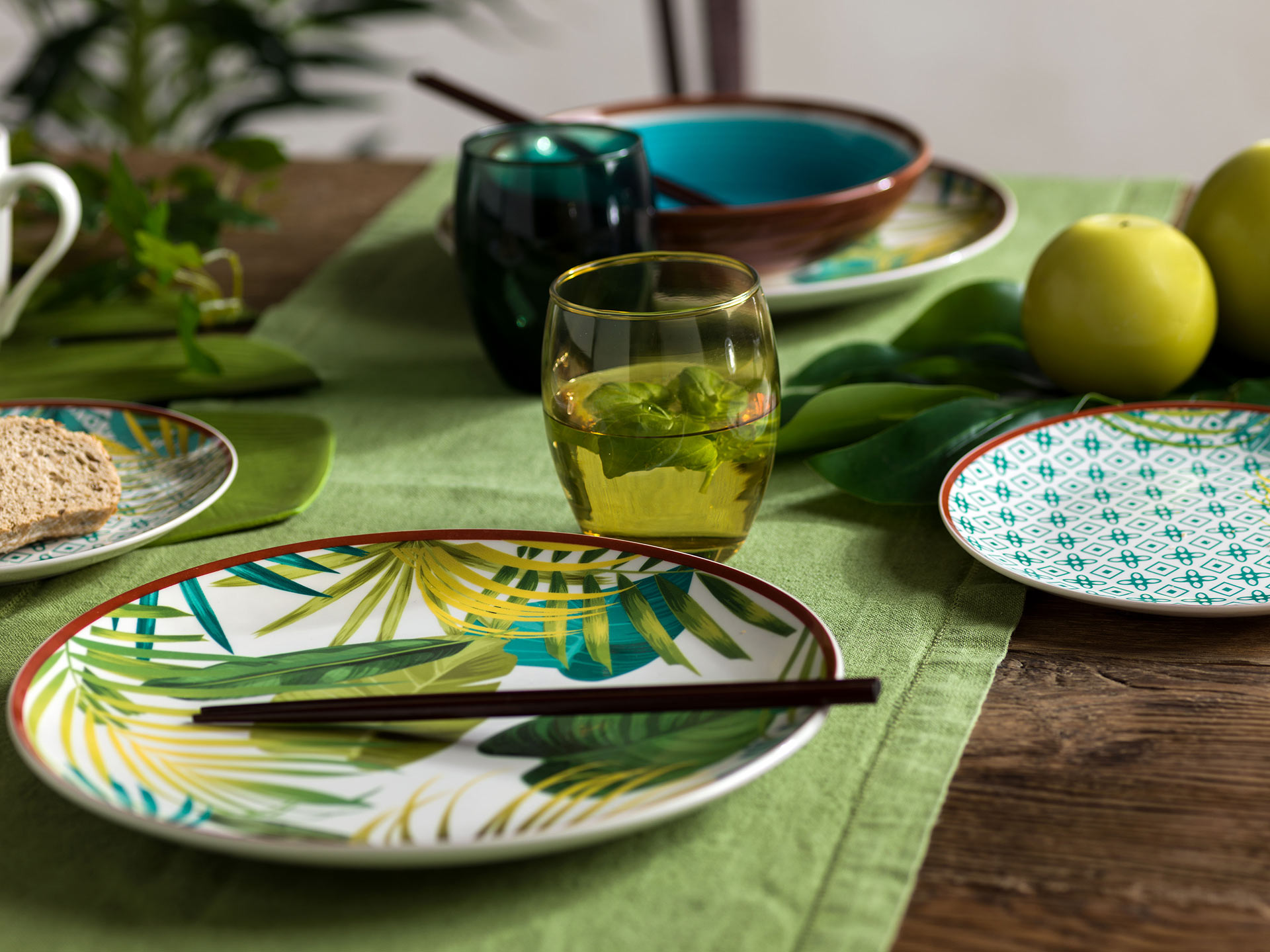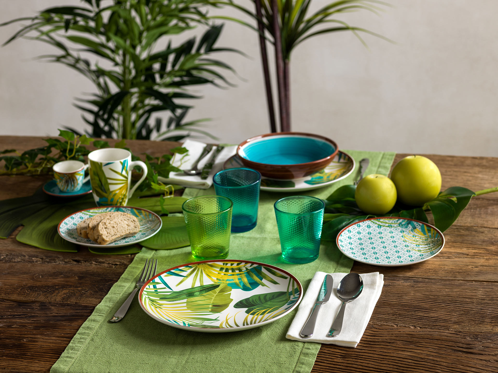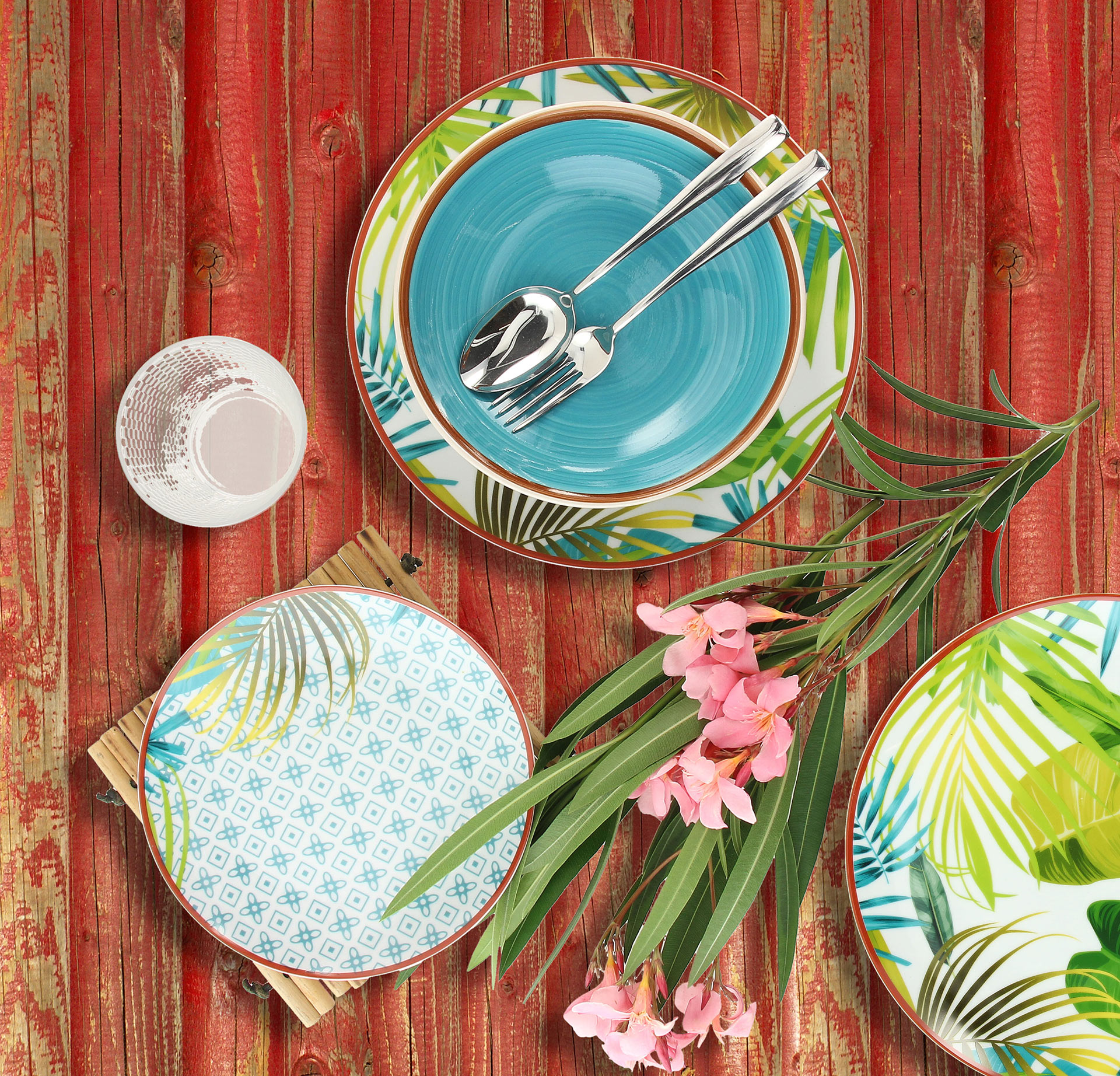 The Jungle table set is made from a combination of fine porcelain and ceramics, with a tropical floral pattern on the dinner plate, a turquoise geometric pattern on the dessert plate, and a soup plate hand-decorated in aquamarine.