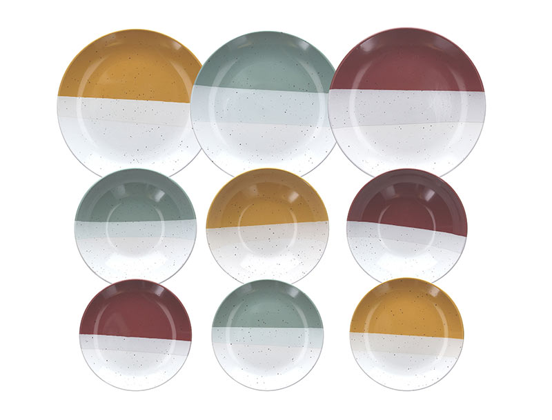 The dinner service of the Layers line has an original pattern: it directs the geometric display of color in three alternatives.