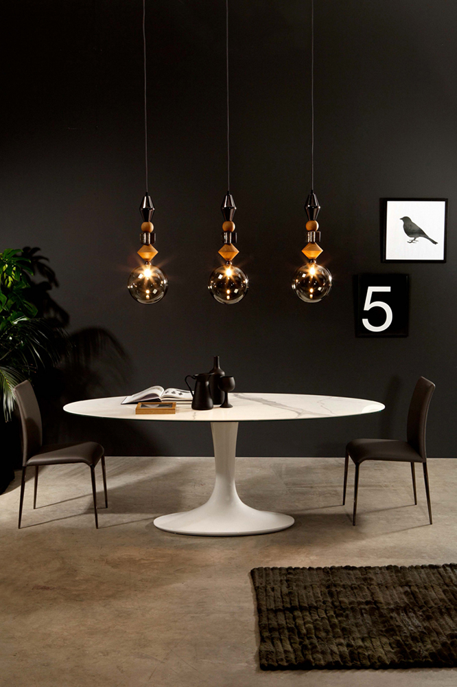 Tonin Casa`s Pandora`s rich and luxurious design, express itself best when enriched by a marvelous lamp. Wooden elements, platinum finishes and glass run one after the other, ending in a simple bulb, perfect to light your rooms.