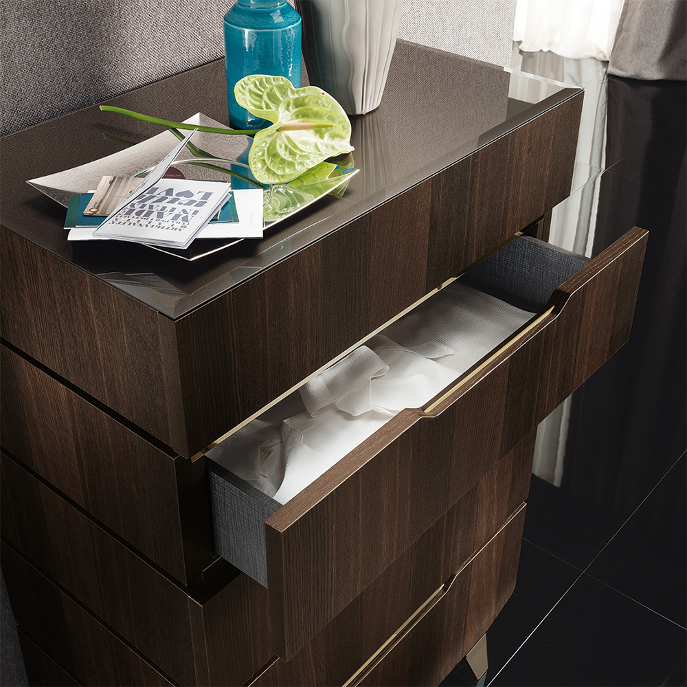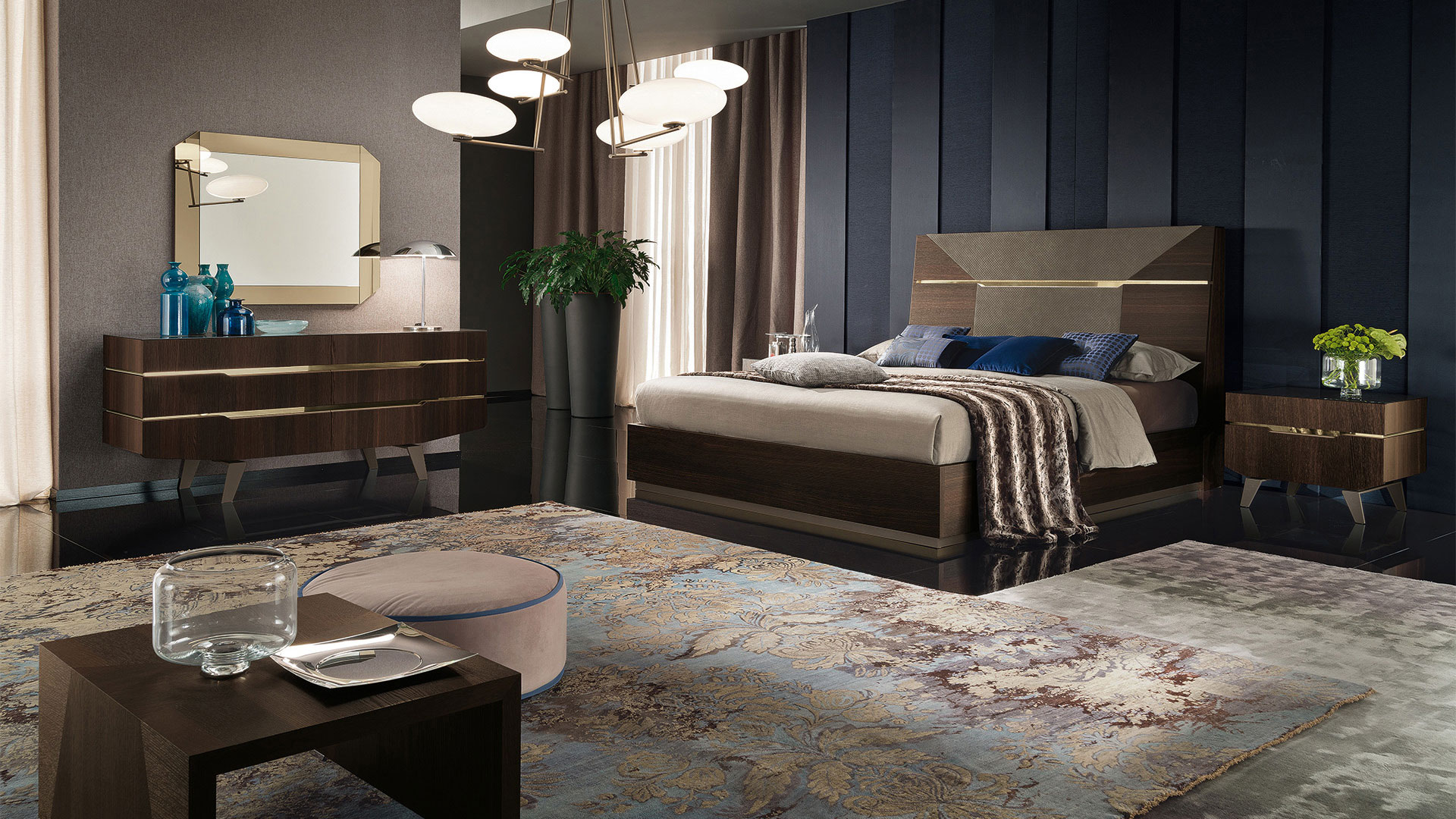 The Accademia bed is crafted in a beautiful and warm Termocotto Oak finish. The beautiful headboard is composed of quilted upholstery that inlays the bed within the beautiful Termocotto Oak. It is fitted with Led lights and golden accents. This piece is imported from Italy.