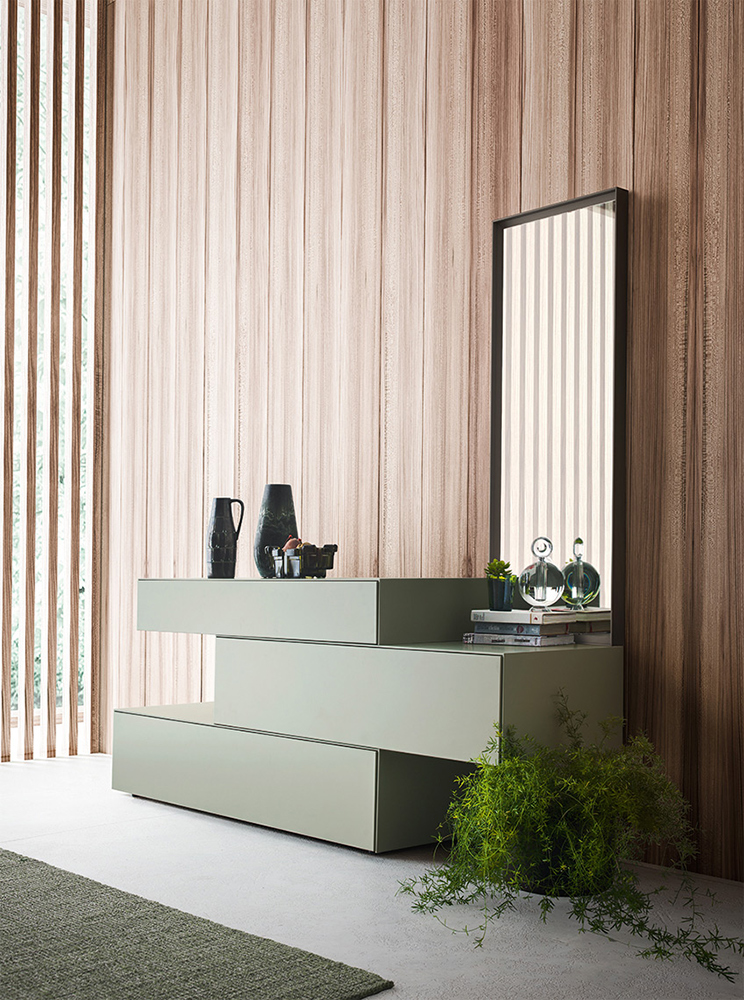 This piece is characterised by its sleek, minimalist lines. Fil is a modular bed unit which can be used in a wide array of compositions. There are two floor-standing options and it can be wall mounted. There are also two ways to open the units, either using the small, asymmetric metal handle or the push-pull mechanism.