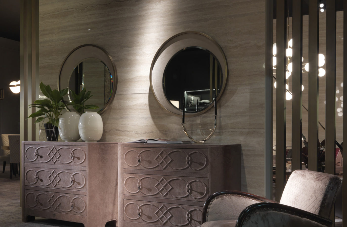 Function and simple elegance are combined in the Carrol mirror. Thanks to its minimalist design and round shape, the mirror easily fit with furniture of any style, emphasizing the game of geometries that characterizes the 2019 collection by Gianfranco Ferré Home.