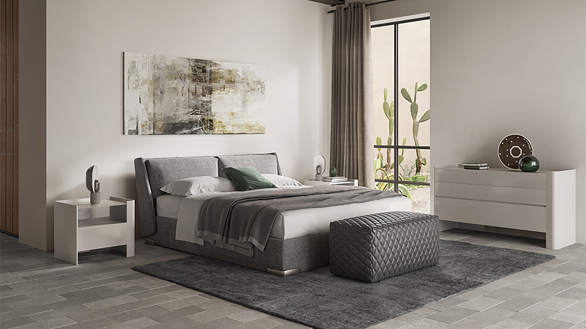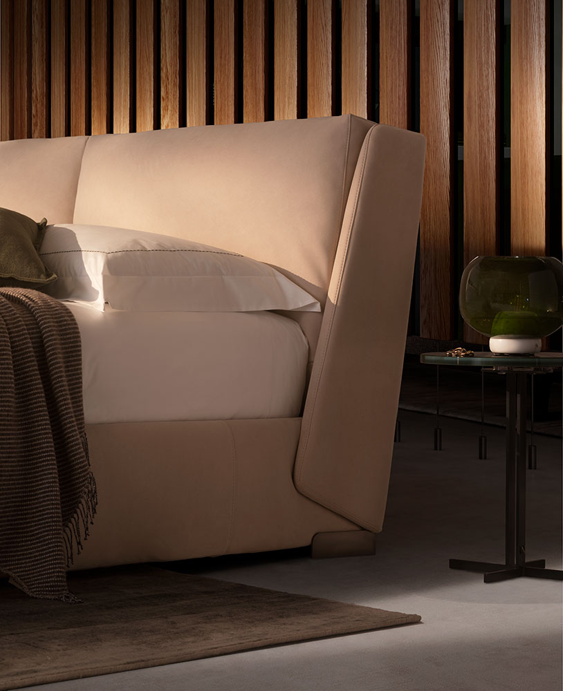 Fenice is the bed which effortlessly brings together aesthetics and function in a triumph of finesse. Cosseted by the big plush cushions on a pectacular looking and the slightly tilted headboard which provides a highly comfortable posture for reading and - obliquely inclined as it dovetails with the bedframe - it also creates an elegant geometric detail.